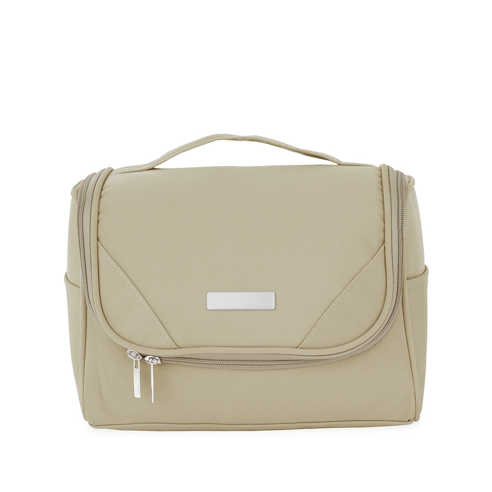 Nécessaire organizadora confeccionada em poliéster impermeável. Conta com bolso interno em tela de nylon com fechamento em zíper, três bolsos abertos e gancho plástico para mantê-la pendurada quando aberta. Acompanha placa personalizável em metal.