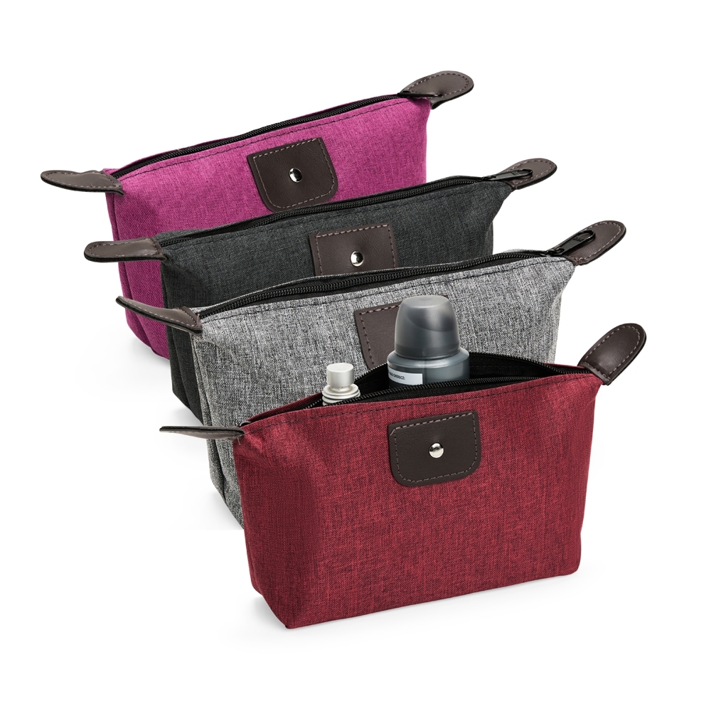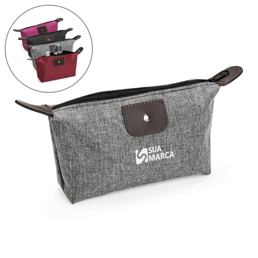 Descrição: Nécessaire compacto confeccionado em Poliéster com mescla de PVC resistente à água, com fechamento em zíper e detalhes em bidim e metal.