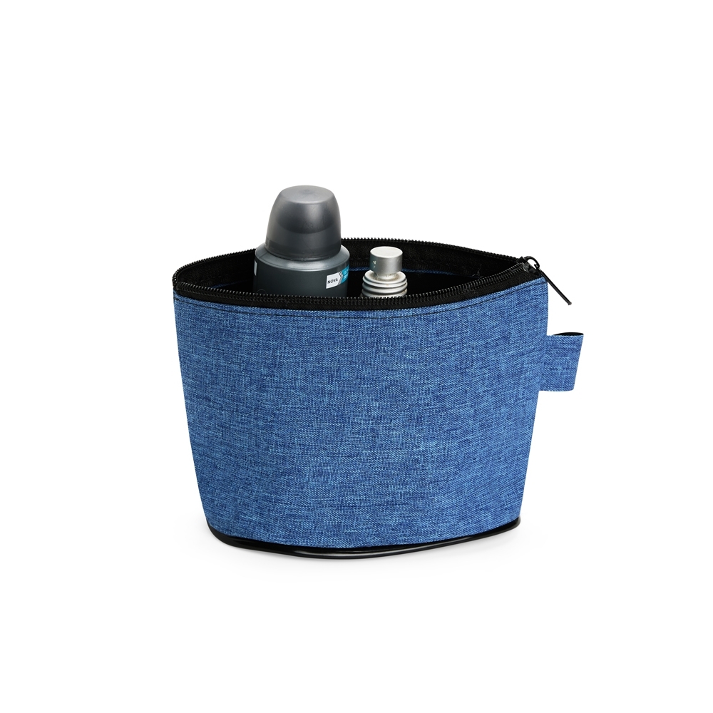 Descrição: Nécessaire resistente à água e confeccionado em poliéster com mescla de PVC. Possui fechamento em zíper e uma pequena alça para fixação de chaveiro ou gancho.