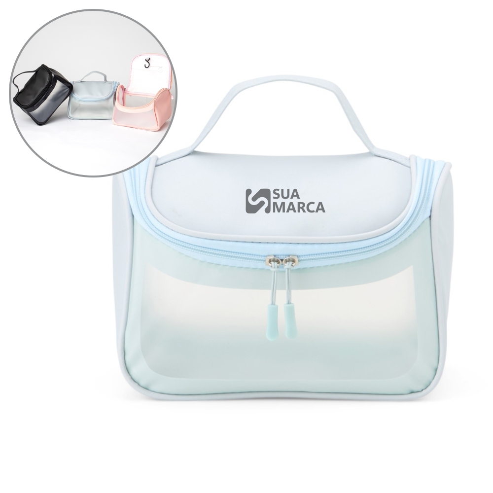Descrição: A nossa Nécessaire feita em PU possui um design de abertura ampla para organizar e armazenar os itens, além da fácil visualização interna por conta do seu visor translúcido na parte frontal/traseira, além da alça para facilitar o transporte. A parte interna conta com bolso e "cabide" plástico para pendurar este item em qualquer lugar. Este brinde será uma excelente escolha para o dia a dia.