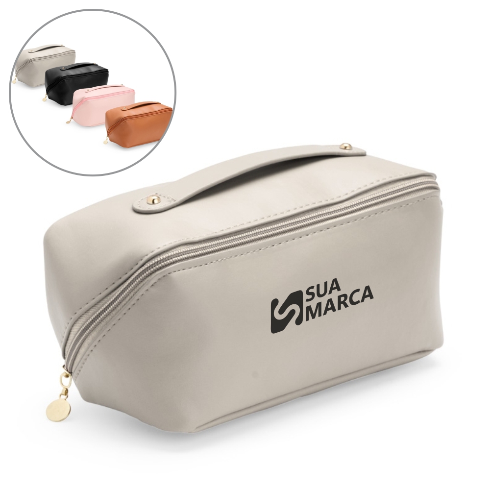 Um nécessaire versátil feito em poliuretano (PU) impermeável com abertura em 180 graus que remete ao formato de uma concha. O compartimento interno conta com dois bolsos laterais abertos e um, localizado na parte central do nécessaire, com fechamento em zíper. Possui alça para transporte.