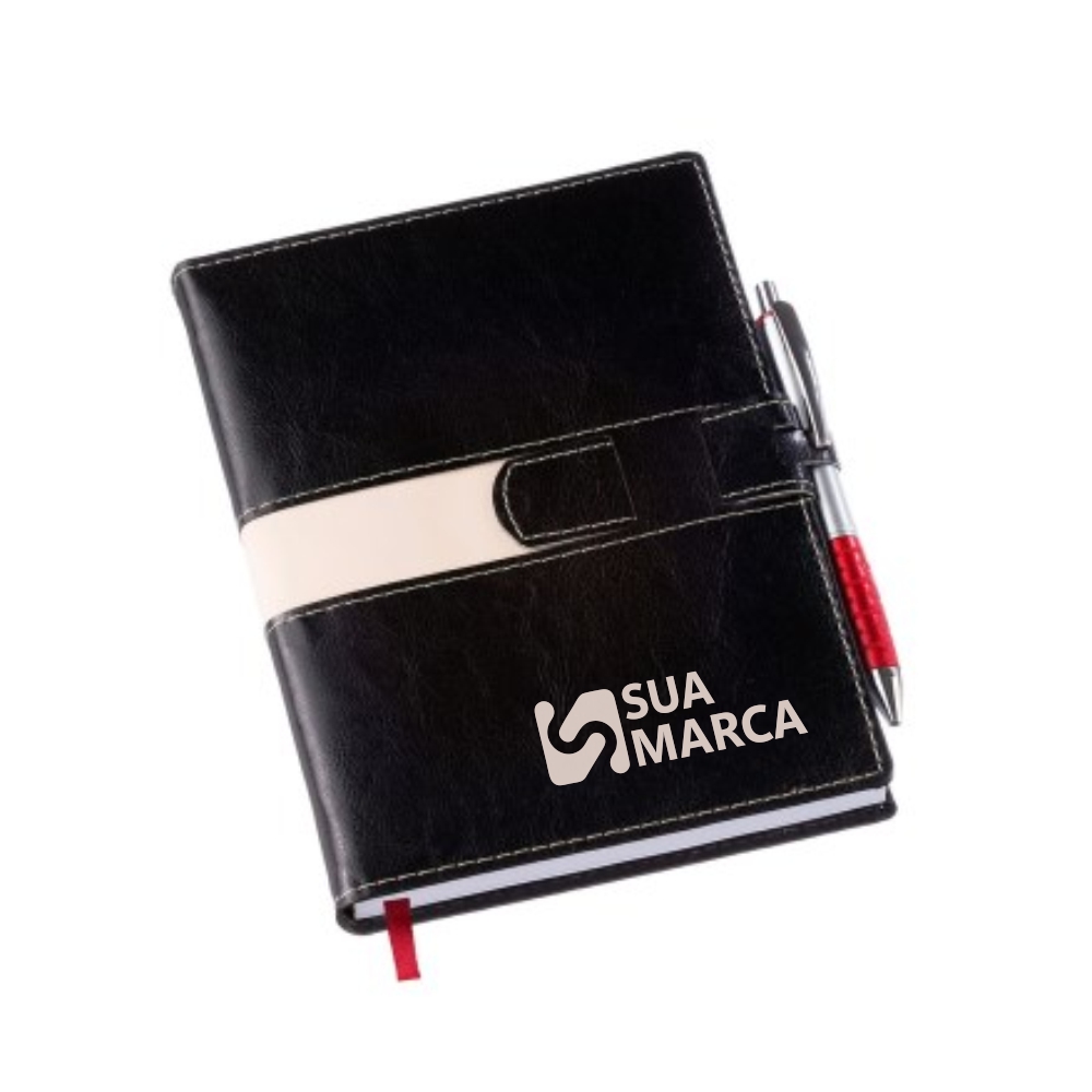 Agenda diária 2026 executiva preta com fecho e suporte para caneta (não inclusa) em couro sintético 0,6mm.