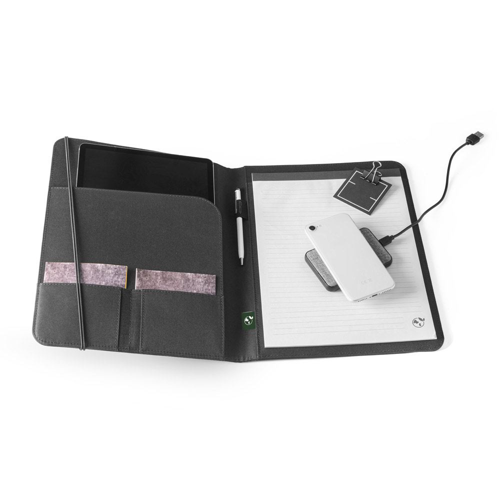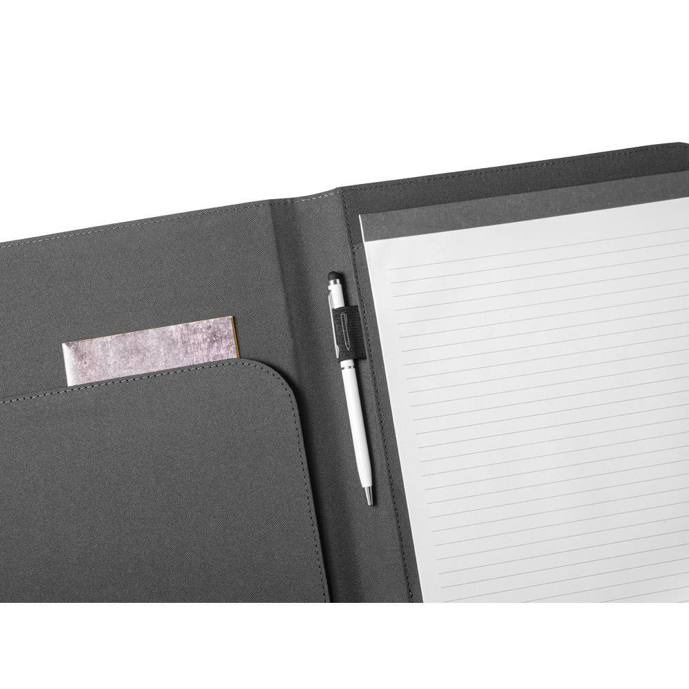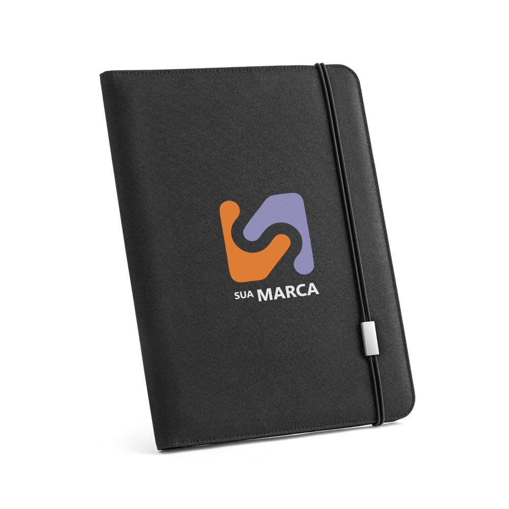 Pasta A4 em 300D poliéster 100% reciclado, com elástico para fecho. O interior contém vários bolsos, suporte para esferográfica (não inclusa) e um caderno com 40 páginas pautadas, em papel proveniente de gestão florestal.