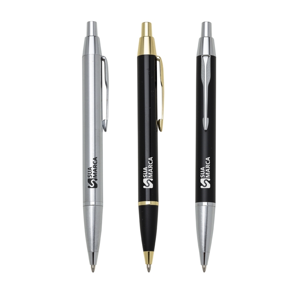 Descrição: Caneta metálica com carga esferográfica azul e acionamento por clique. OBS.: PEDIDO APENAS MÚLTIPLO DE 50 PEÇAS!