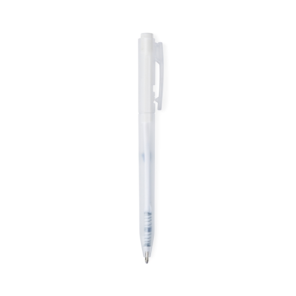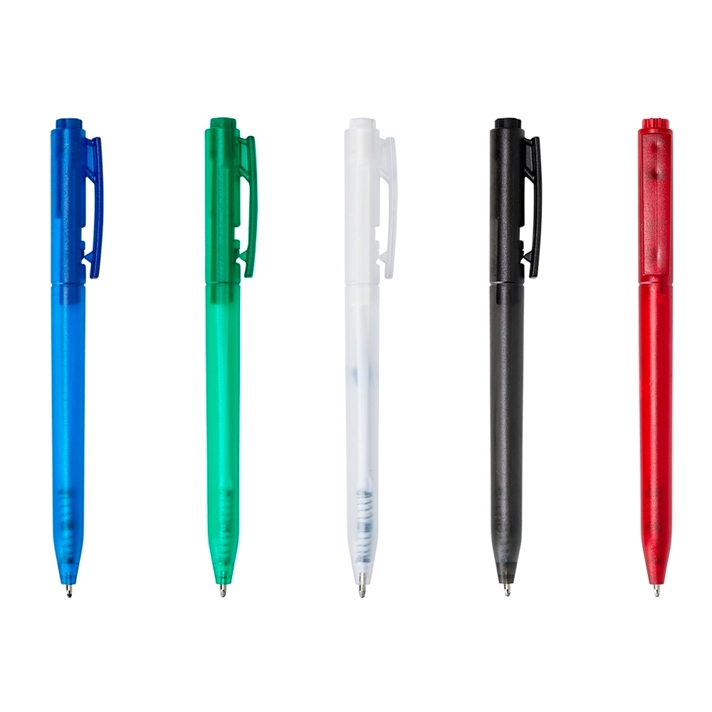 Descrição: Caneta plástica translúcida com carga esferográfica preta 1mm e acionamento por clique.