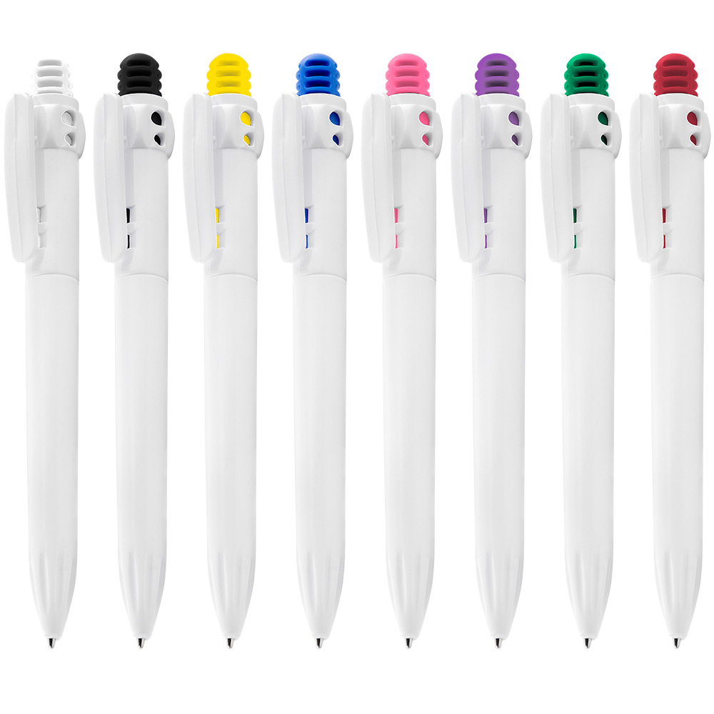 Caneta plástica esferográfica retrátil com grip, escrita azul e disponível em diversas cores.