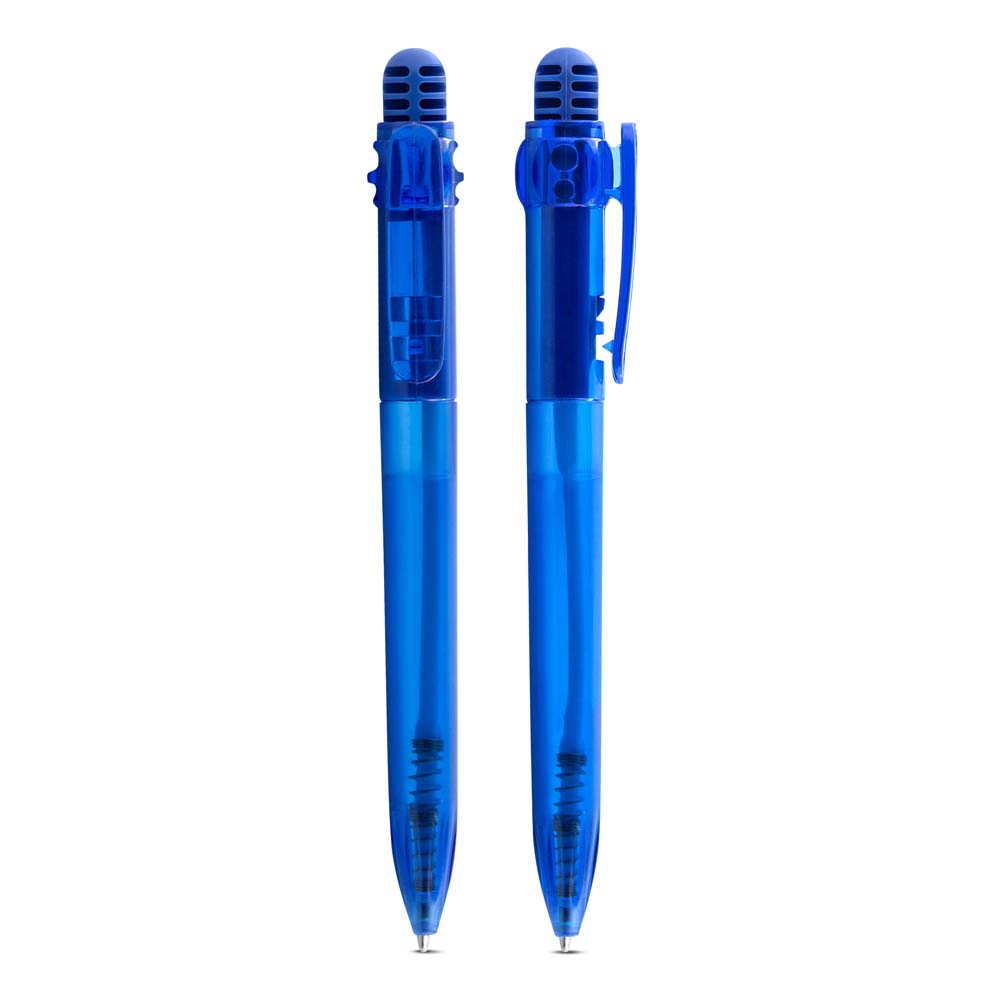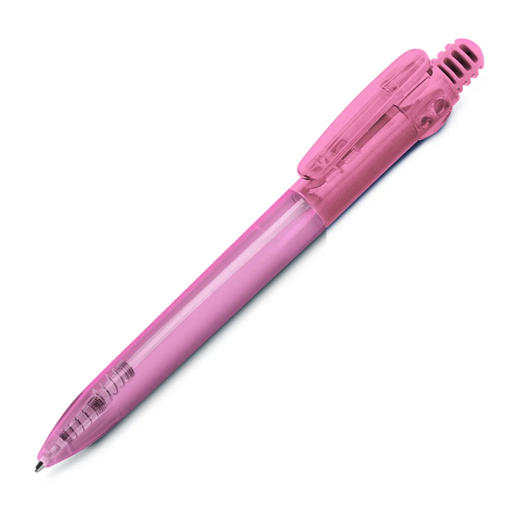 Caneta plástica translúcida, esferográfica, retrátil com grip, escrita azul e disponível em diversas cores.