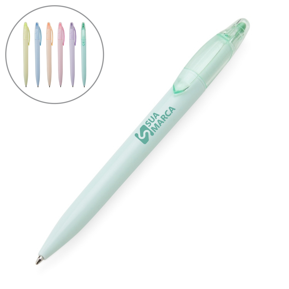 Descrição: Caneta plástica com marca texto com tampa protetora para o marca texto, carga esferográfica azul 1.0mm e acionamento por rotação.