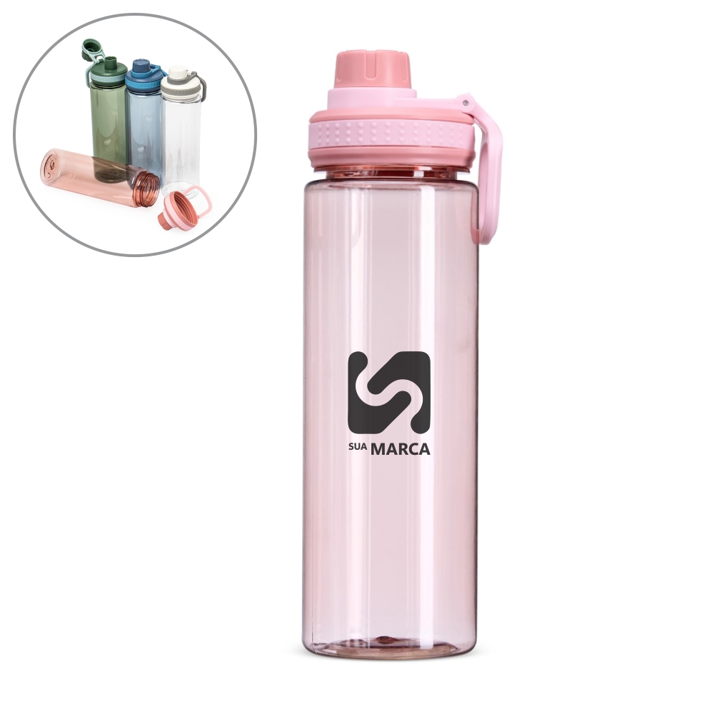 Descrição: Garrafa plástica de 750ml com tampa rosqueável e bocal, tampa protetora e alça para facilitar o transporte.