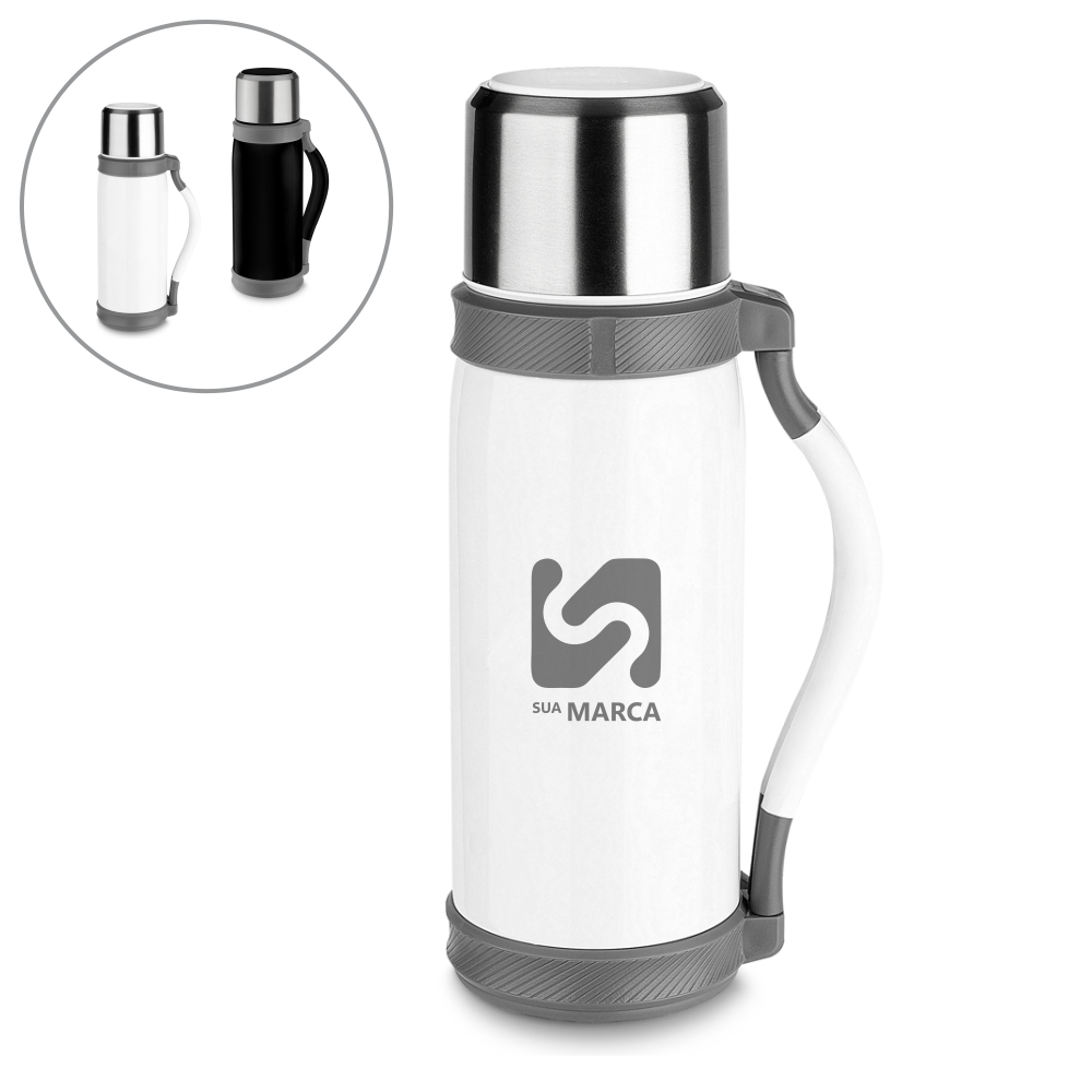 Garrafa térmica em aço inox com parede dupla isolada a vácuo, com capacidade de até 1,2l. Além de garantir a temperatura ideal do líquido por horas, é muito fácil de ser transportada por sua alça lateral que torna o uso desse potente recipiente muito mais simples. Tampa rosqueável e anel de silicone para vedação na tampa.