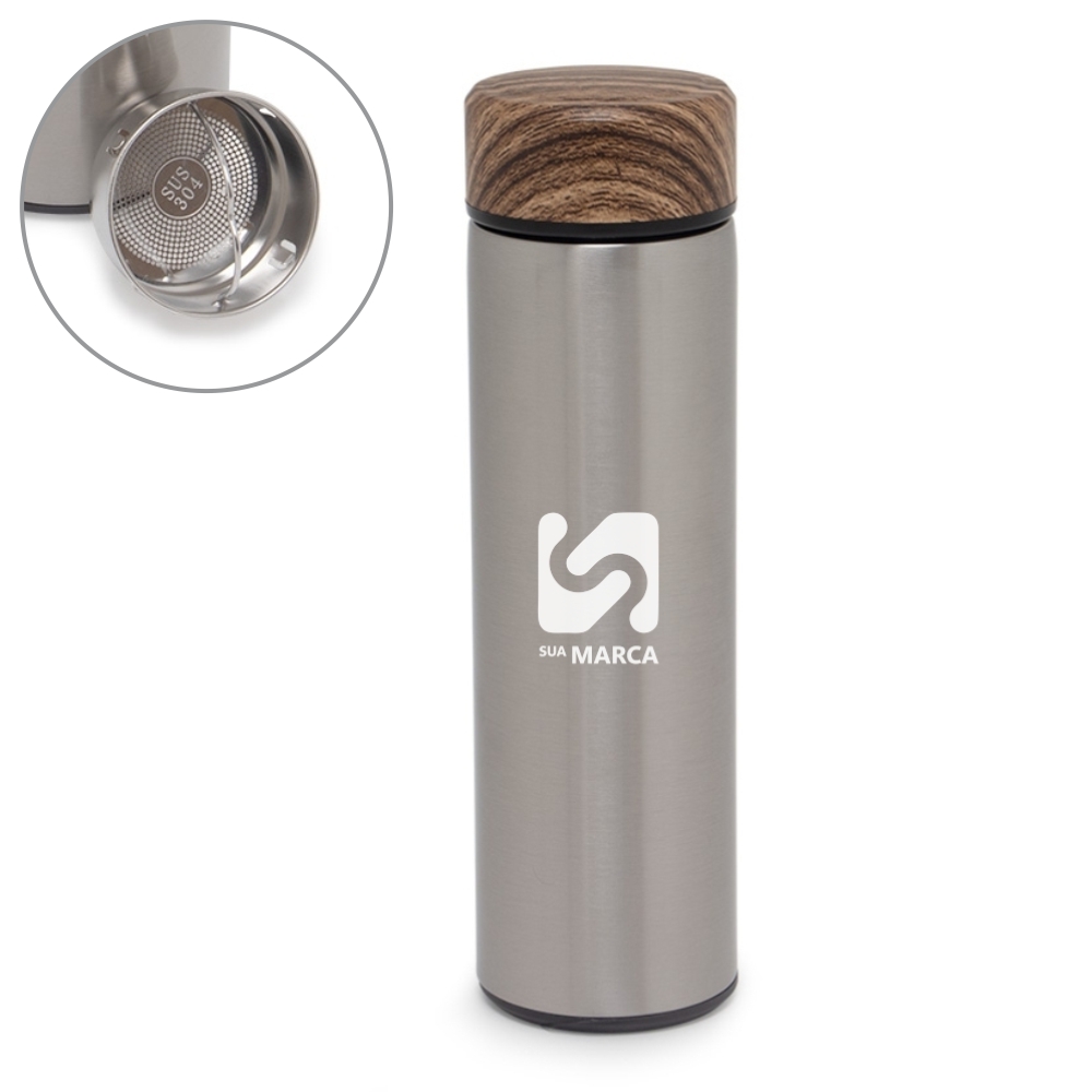 Garrafa térmica 500ml em inox com parede dupla, infusor e tampa rosqueável com detalhe em madeira.