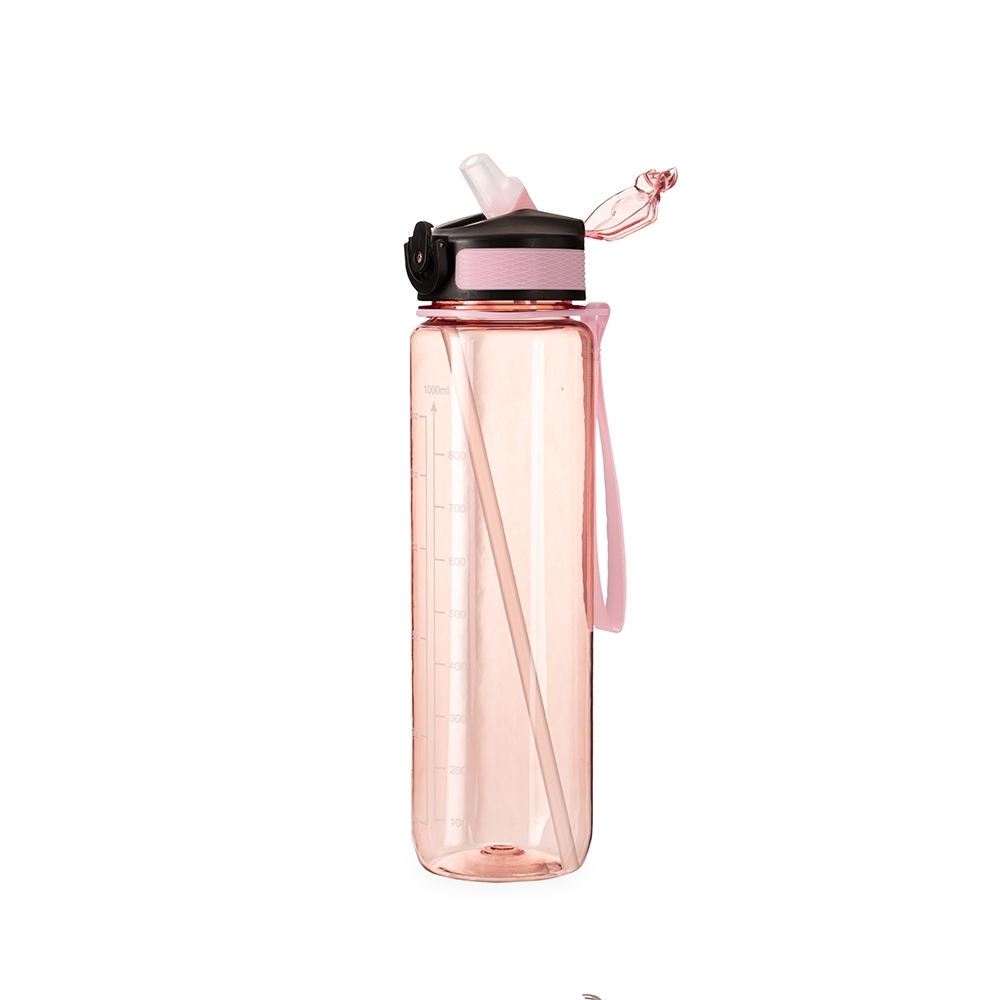 Squeeze plástico livre de BPA com capacidade máxima de 1,05L e marcação de volume de até 1L. Possui tampa rosqueável com bico flip, tampa protetora, botão de acionamento com trava de segurança. Acompanha canudo interno em plástico e alça para transporte em nylon.