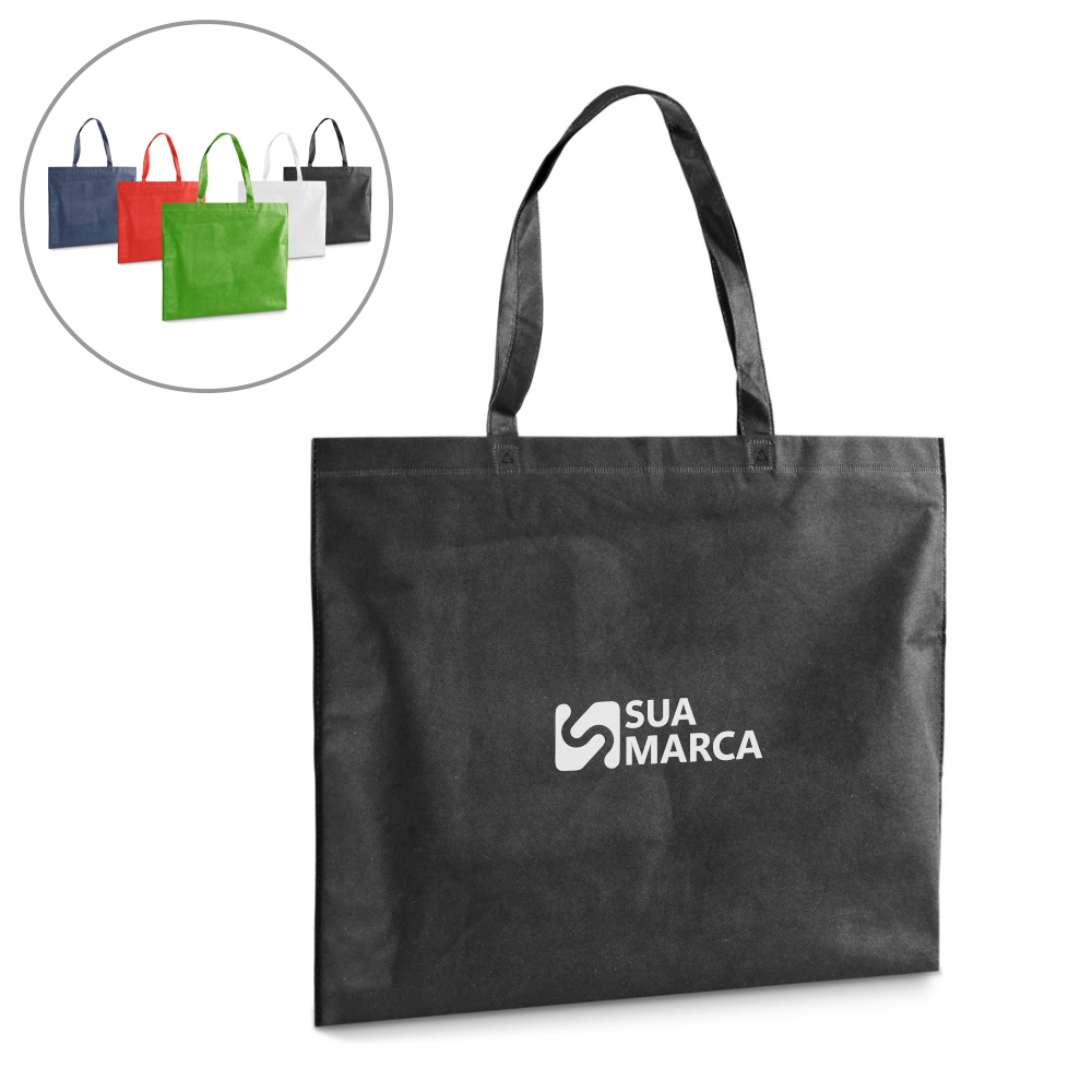 Sacola. Non-woven: 80 g/m². Termo-selado. Alças de 55 cm. 480 x 380 x 85 mm.