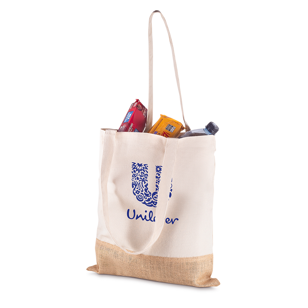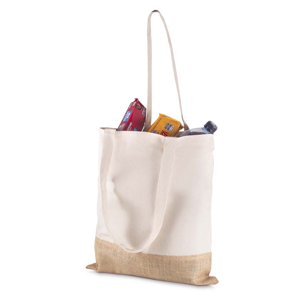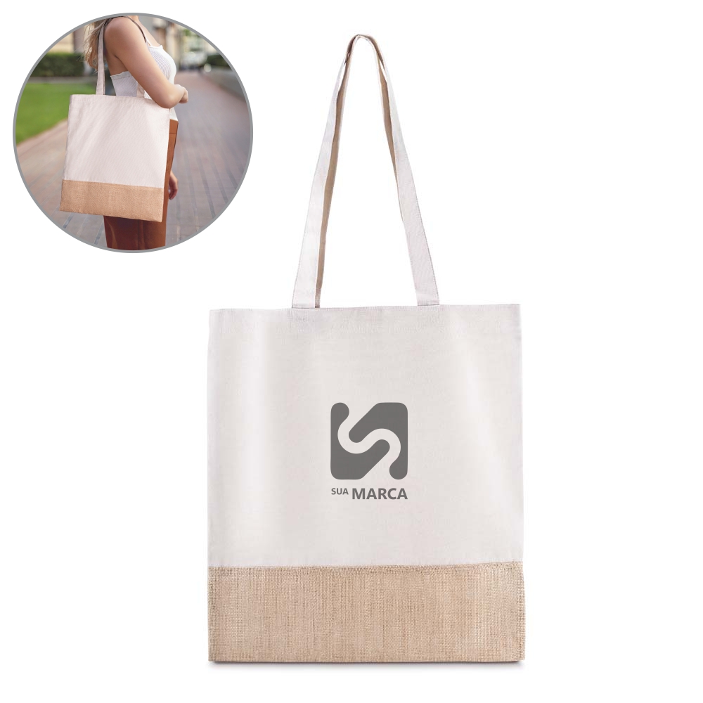 Sacola em Algodão Cru 220g/m² com detalhe em Juta. Alça com altura de 30 cm, ideal para transporte.
