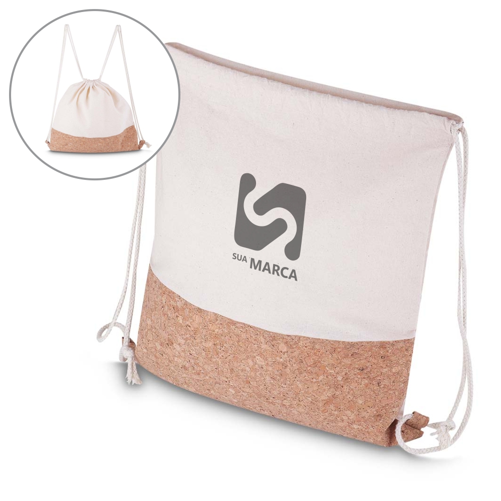 Bolsa em algodão cru com detalhe em cortiça, alça dupla para colocar nas costas.