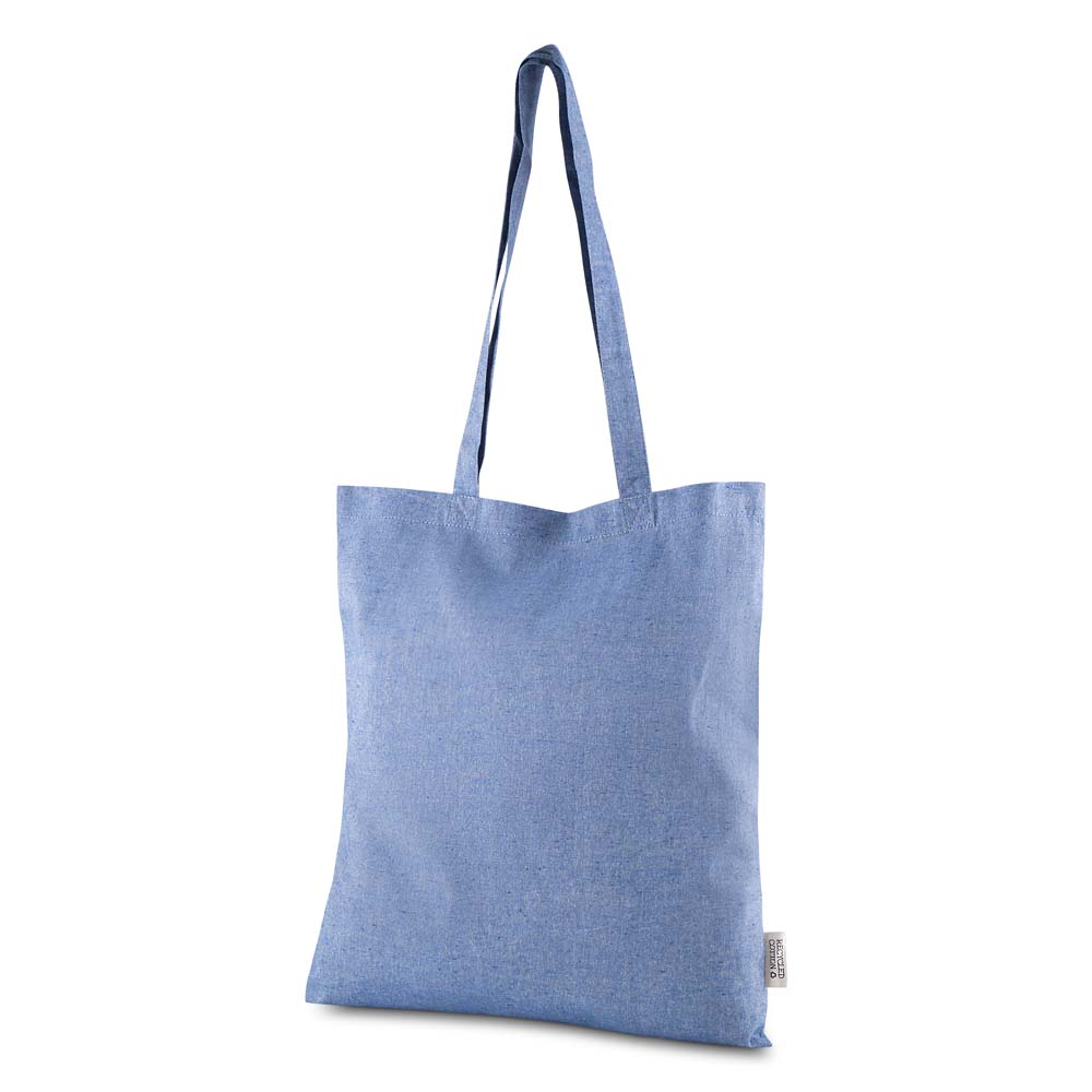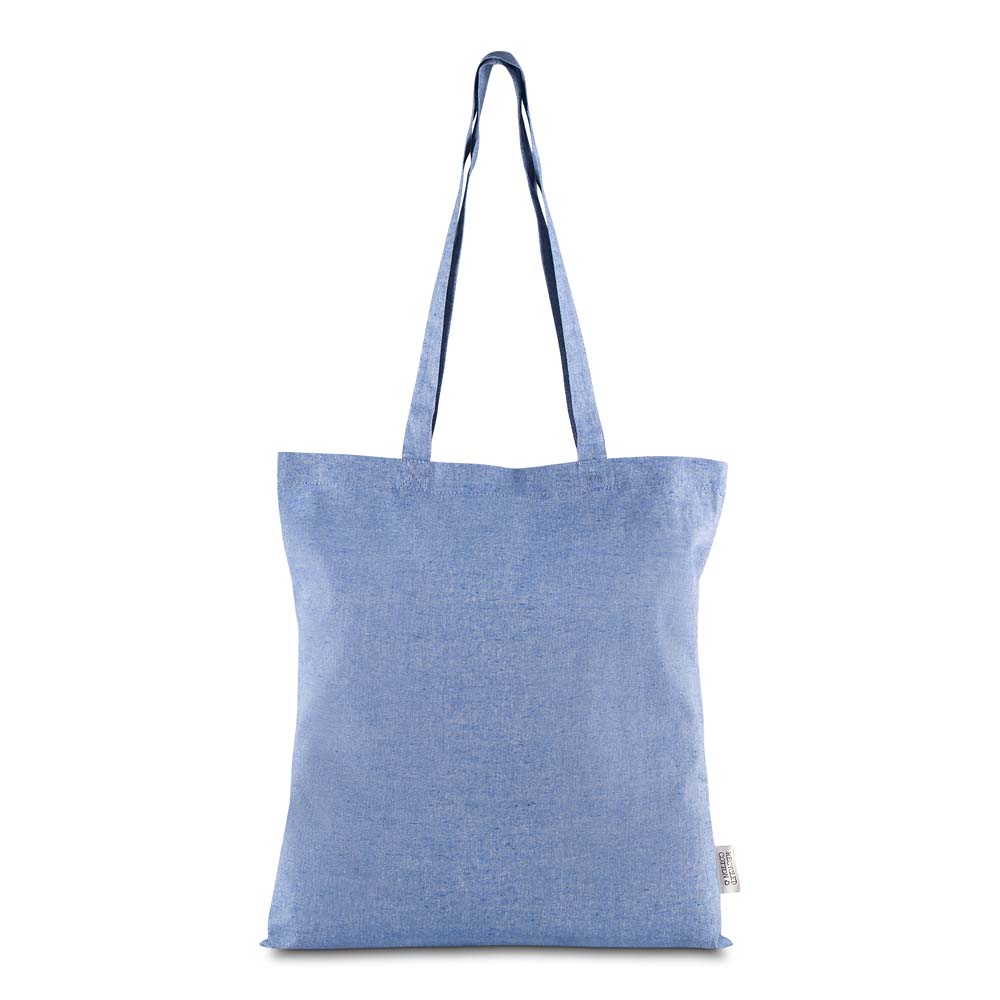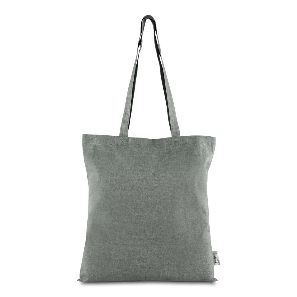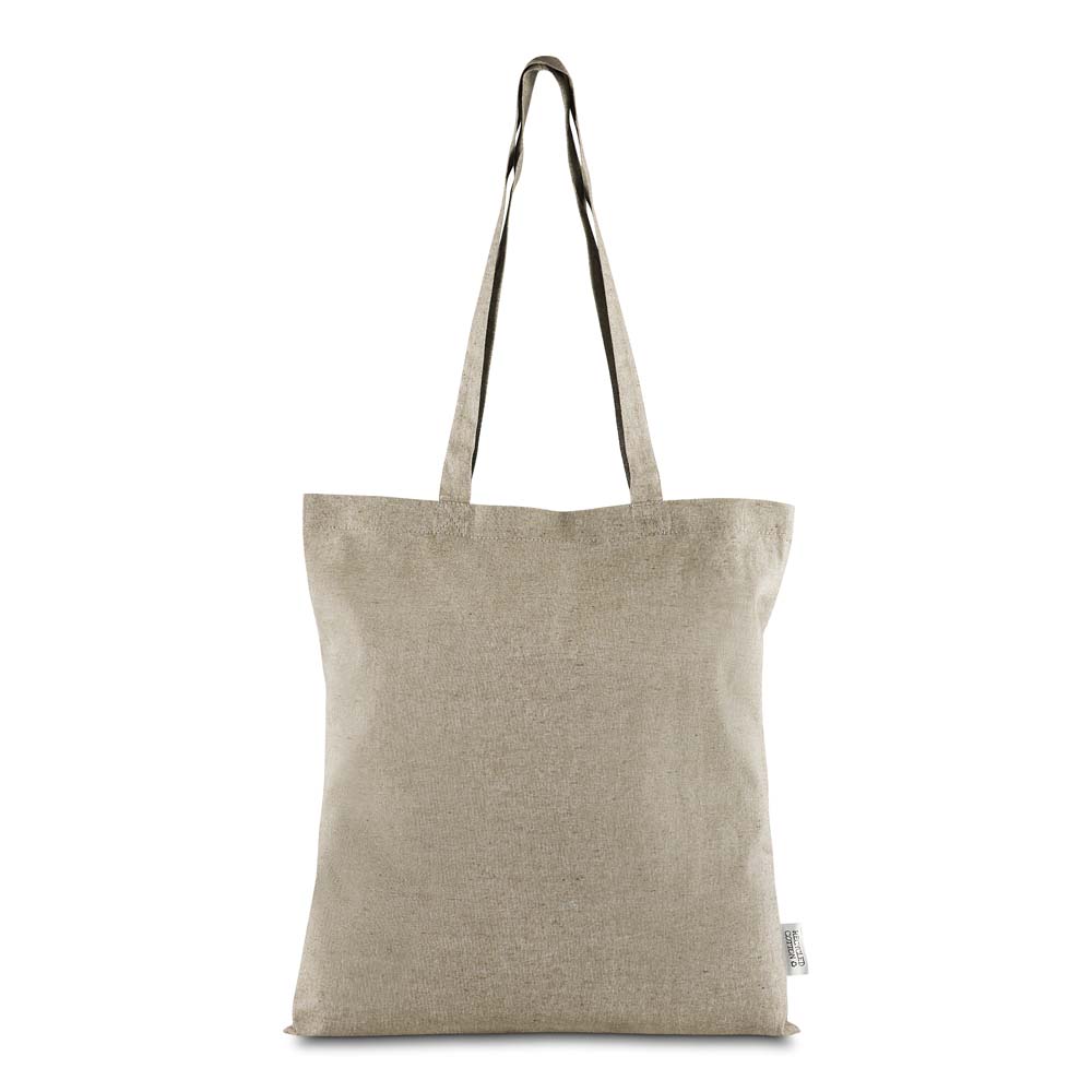 Sacola confeccionada em algodão mescla reciclado, gramatura 140 g/m². Possui alça de 65 cm ponta a ponta.