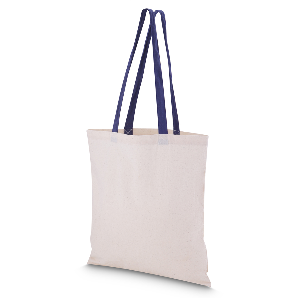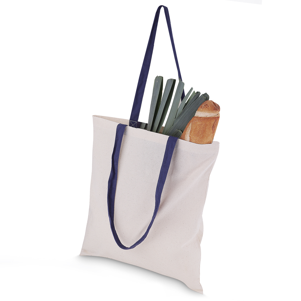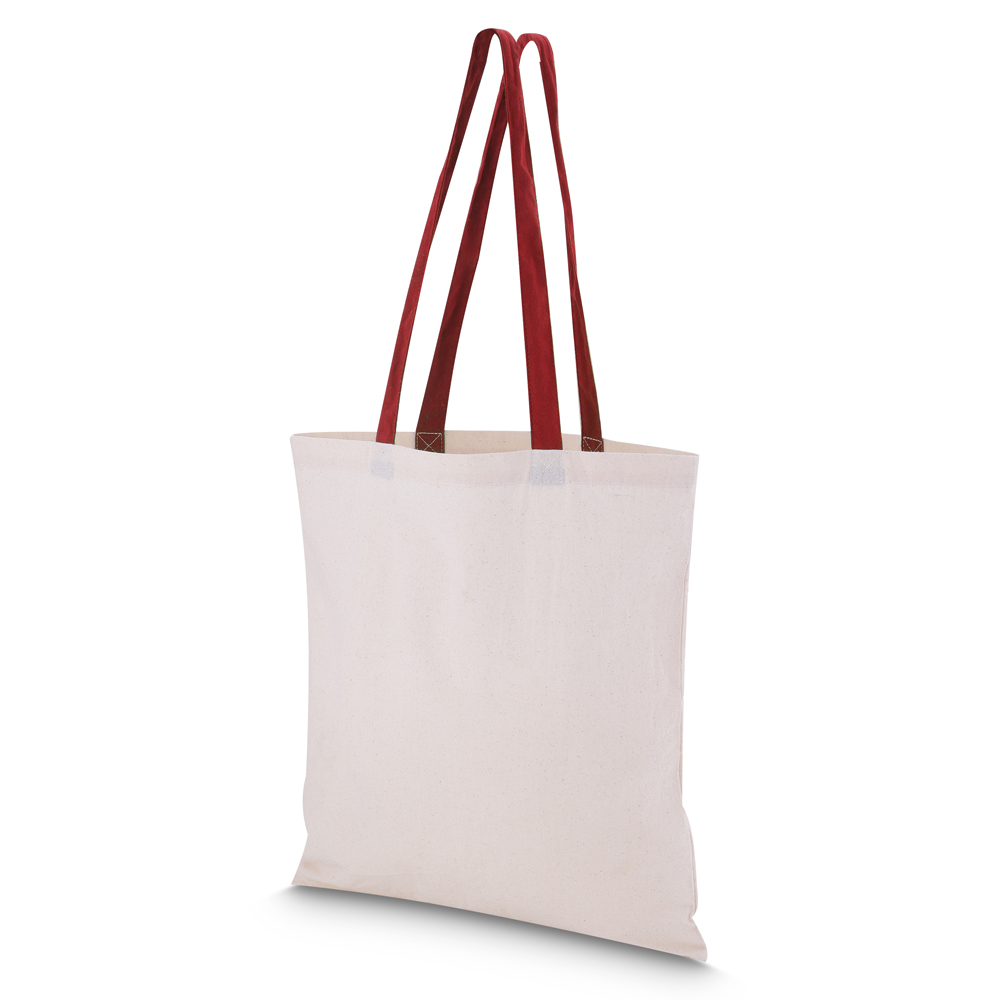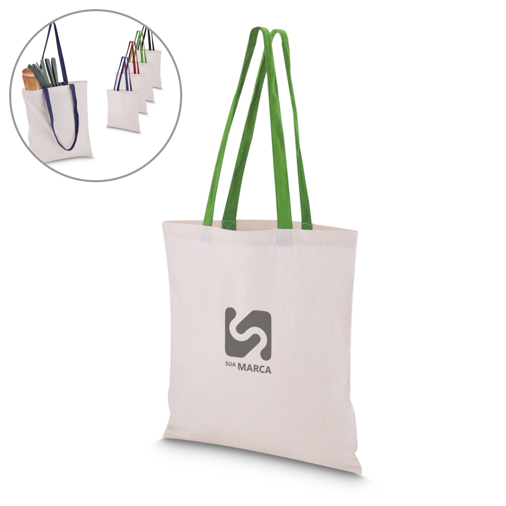 Sacola em algodão cru 140g/m² com alça colorida em algodão liso. Alça com altura de 29 cm, ideal para transporte.