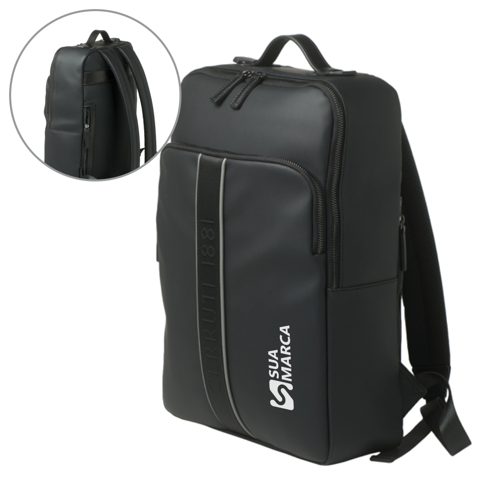 Mochila para notebook. C. sintético. Interior forrado, com divisória para notebook. Bolso frontal e bolso na parte posterior, com zíper. Alças almofadadas. Fornecida com embalagem de algodão. 310 x 410 x 110 mm.