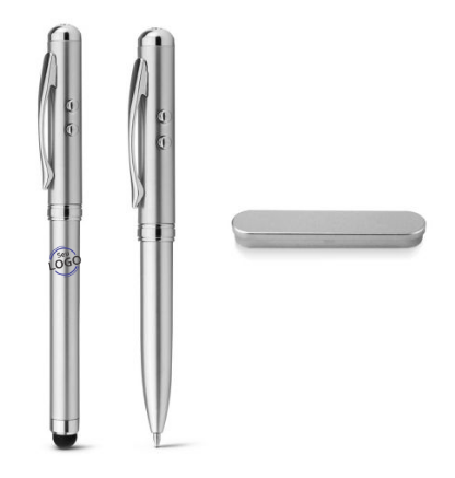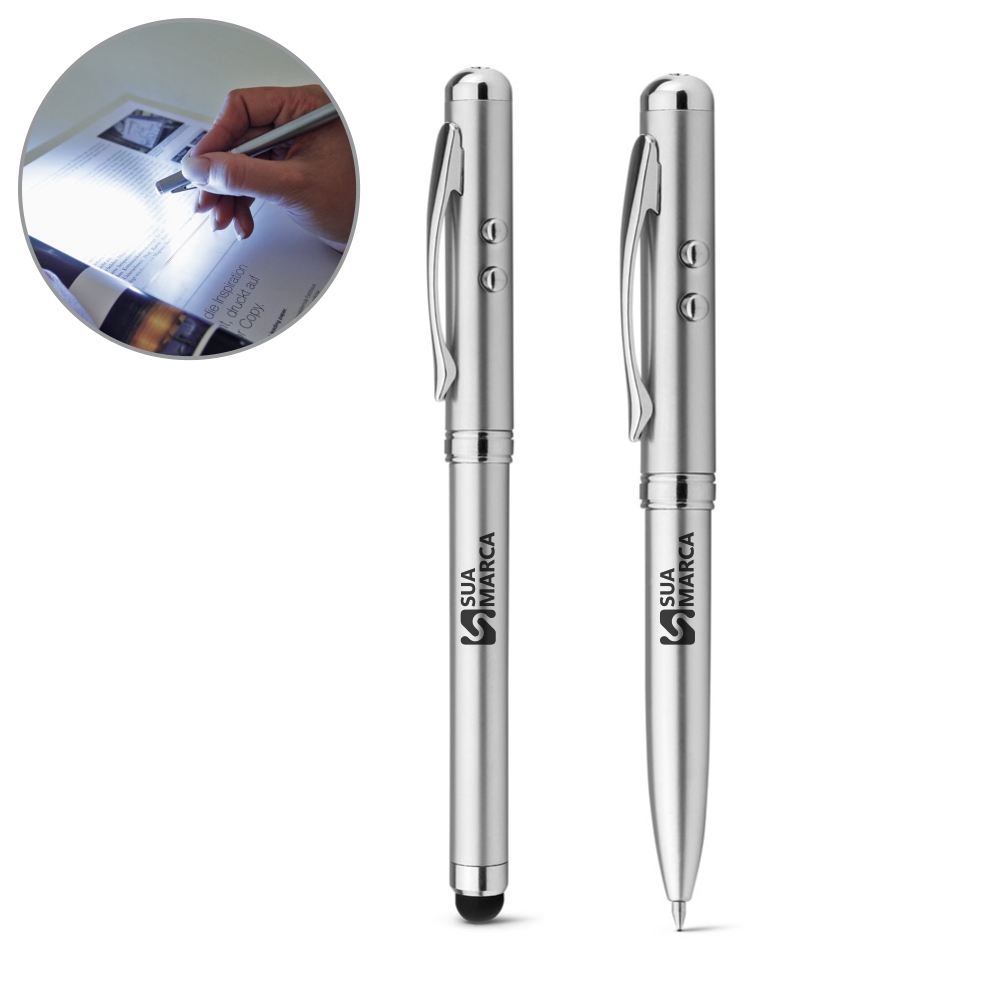 Esferográfica multifunções em metal com clipe. Esferográfica com mini lanterna LED, apontador laser e ponteira touch. Incluso 3 pilhas LR41. Fornecida em estojo metálico com forro de veludo. ø10 x 125 mm | Caixa: 178 x 38 x 19 mm.