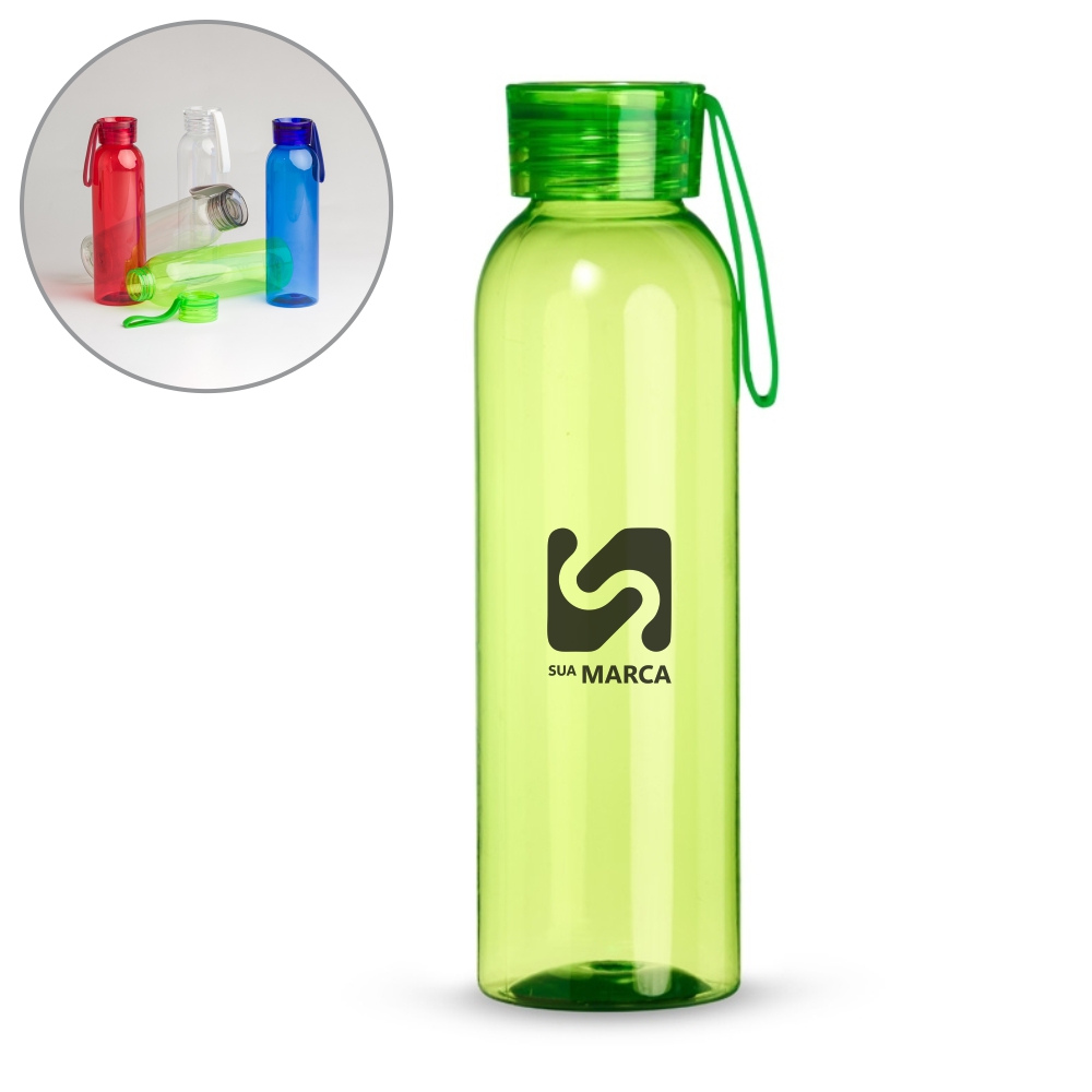Descrição: Garrafa plástica 610ml livre BPA com tampa rosqueável com alça de silicone.