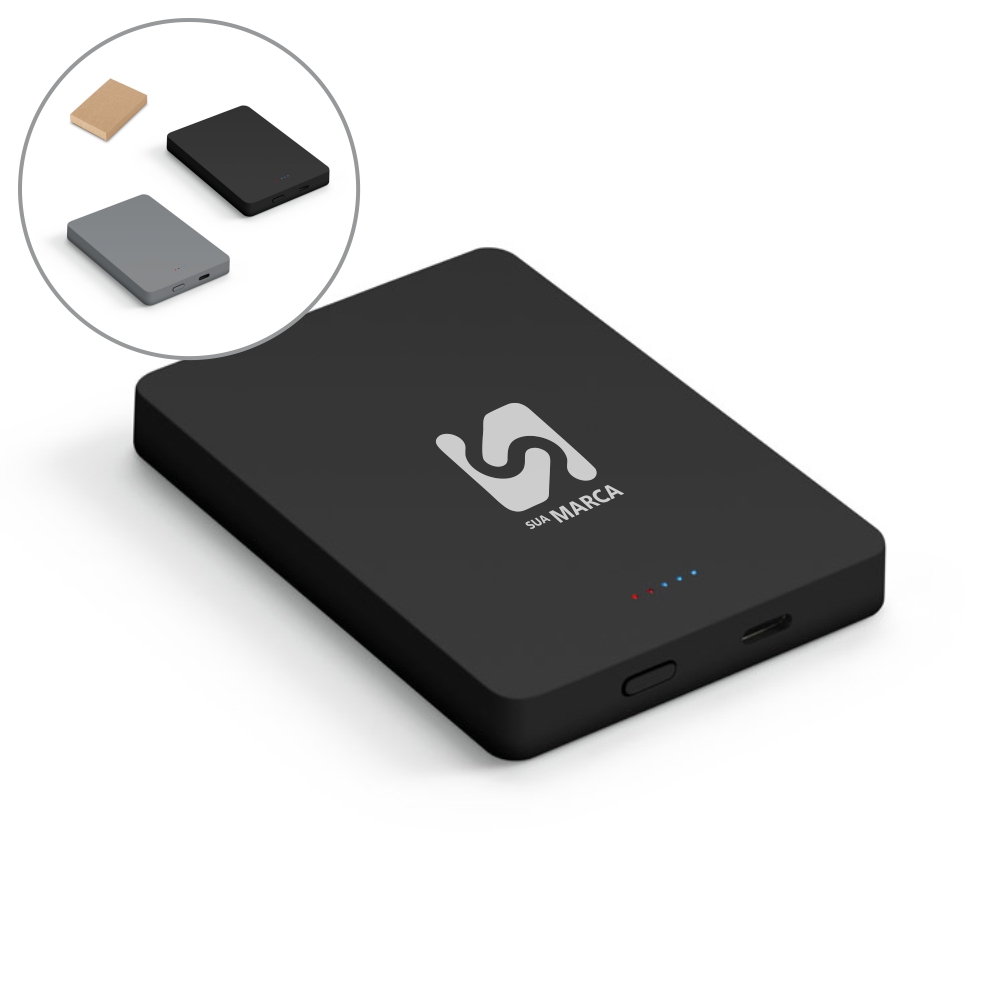 Bateria portátil de carregamento rápido em ABS 100% reciclado com acabamento em mate. A bateria leve em lítio e com design slim, tem uma capacidade de 10.000 mAh e tempo de vida ≥ 300 ciclos. Esta bateria portátil torna-se muito prática para o dia a dia uma vez que permite, através do seu magnetismo, prender atrás dos smartphones ou capas com este sistema. Possui entrada/saída USB-C e potência máxima de 15W para carregamento rápido sem fios. Compatível com smartphones com tecnologia de carregamento sem fios. Incluso cabo USB-C para carregamento rápido. Fornecido em caixa presente de papel kraft reciclado. 90 x 65 x 19 mm | Caixa: 91 x 76 x 23 mm