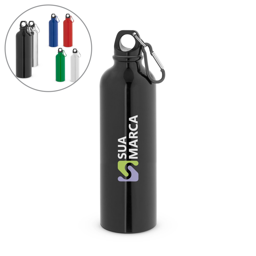 Squeeze esportiva em aço inox, de parede simples e acabamento brilhante. A tampa tem um mosquetão que facilita seu transporte ou pode ser pendurado numa mochila. Capacidade até 820ml.