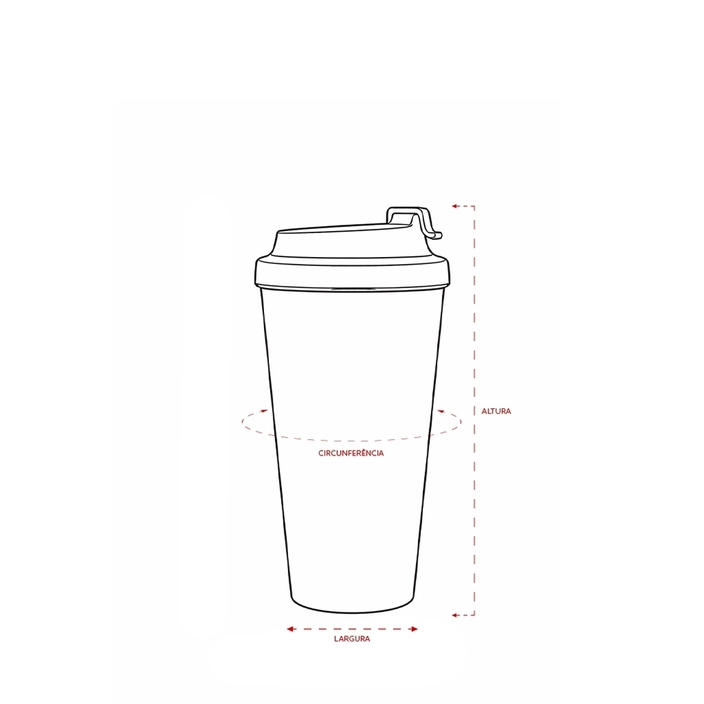 Copo em inox 304 com revestimento externo em polipropileno (PP) e capacidade para até 480ml. Apresenta tampa rosqueável em PP com protetor para o bocal. Acompanha alça em nylon com detalhe em couro sintético para transporte.