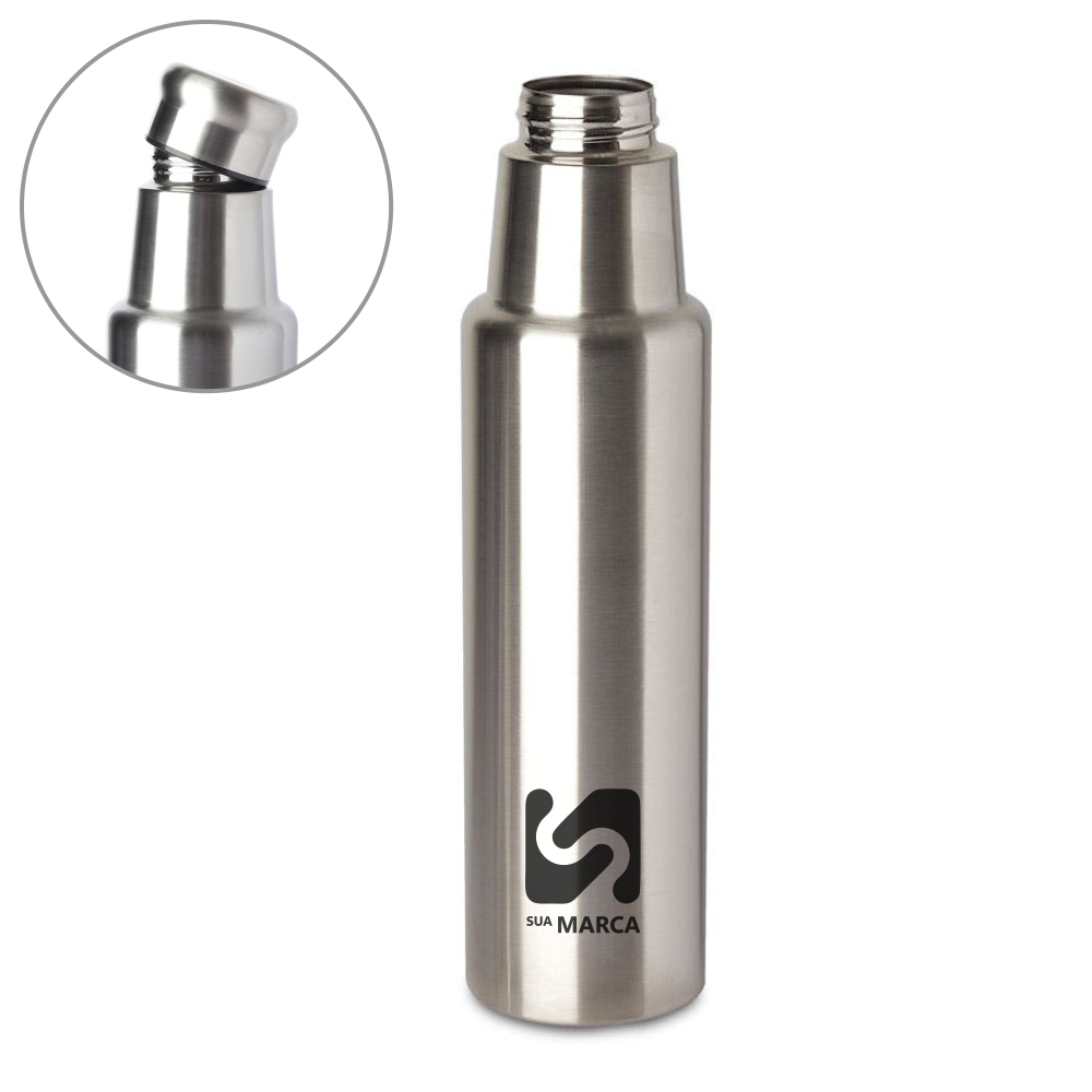 Garrafa em aço inoxi 201 de parede única. Com tampa rosqueavel e anel de silicone para vedação na tampa. Com capacidade de até 1L.