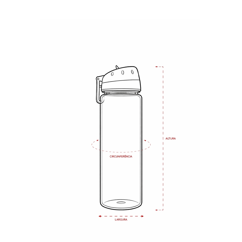 Squeeze feito em plástico AS livre de BPA, capacidade máxima e marcação de volume de até 700ml. Possui tampa rosqueável em polipropileno (PP) com bico flip em poliestireno (PS), anel de vedação em silicone, canudo removível e alça fixa para transporte.