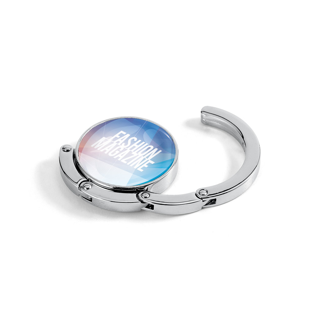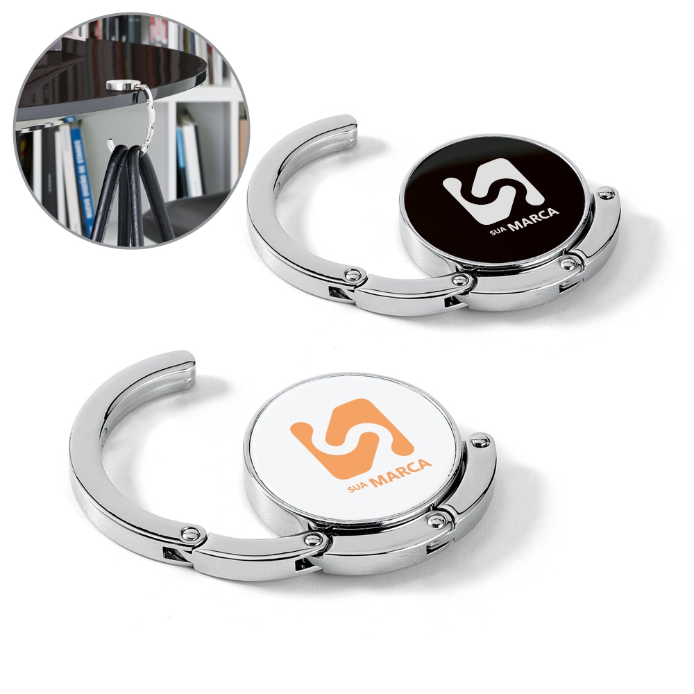 Suporte de bolsa resistente em metal. O suporte pode ser colocado numa superfície para pendurar a sua bolsa.