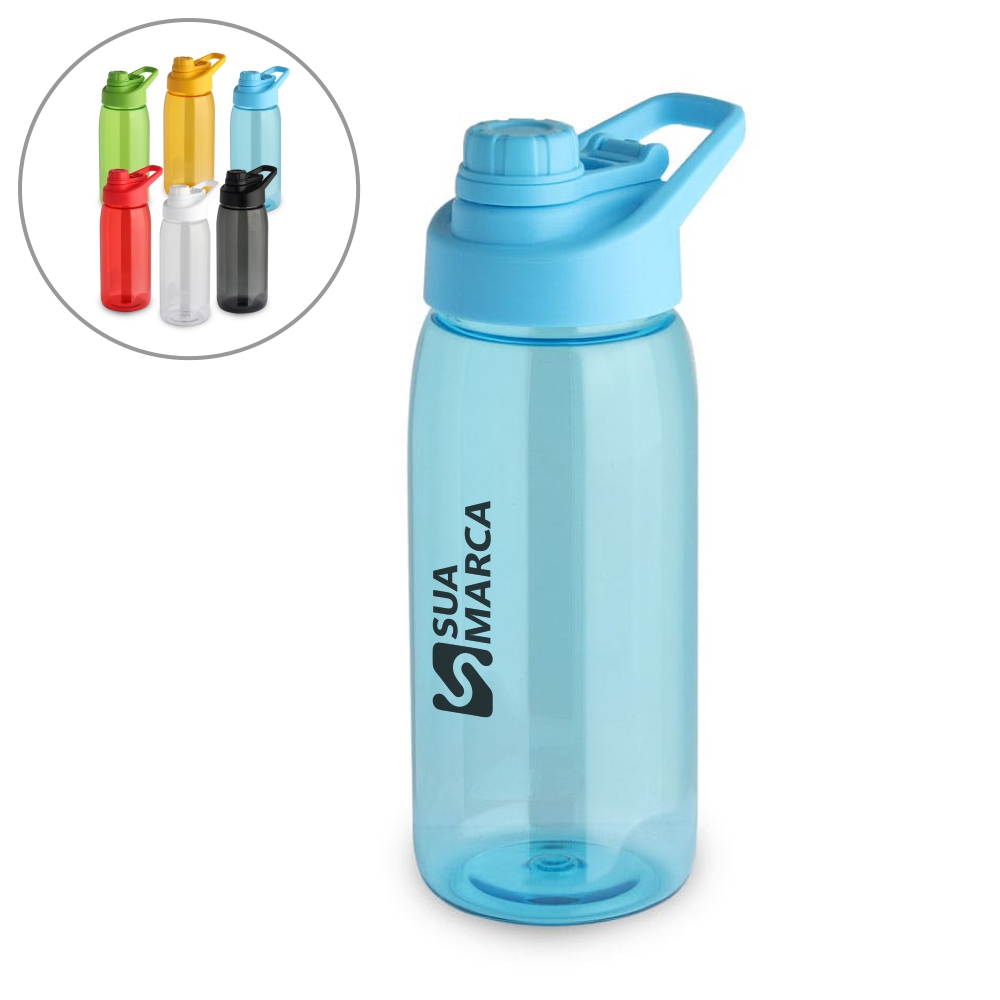 Garrafa em plástico ABS, tampa em plástico na cor do produto com anel de silicone para vedação. Capacidade: 600ml