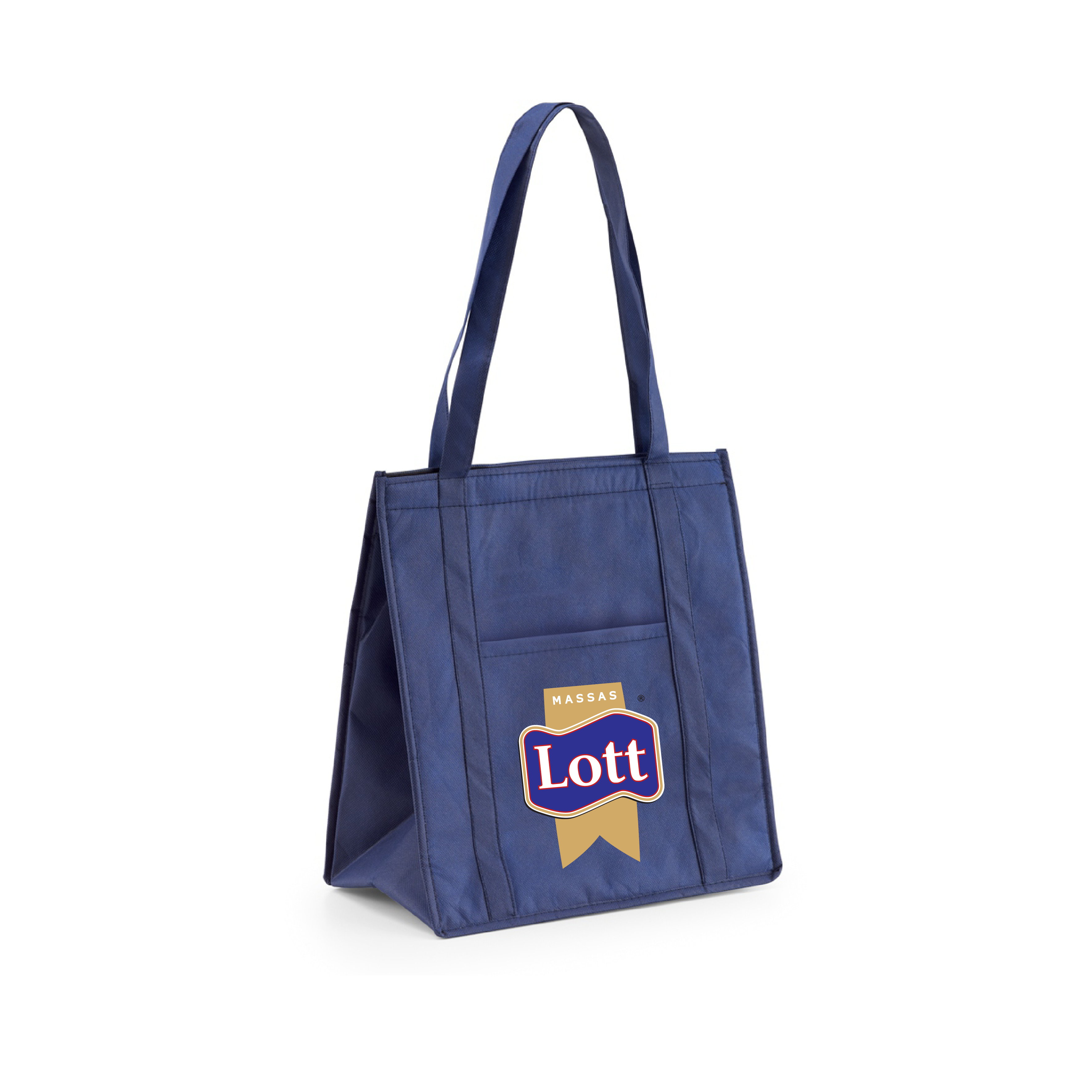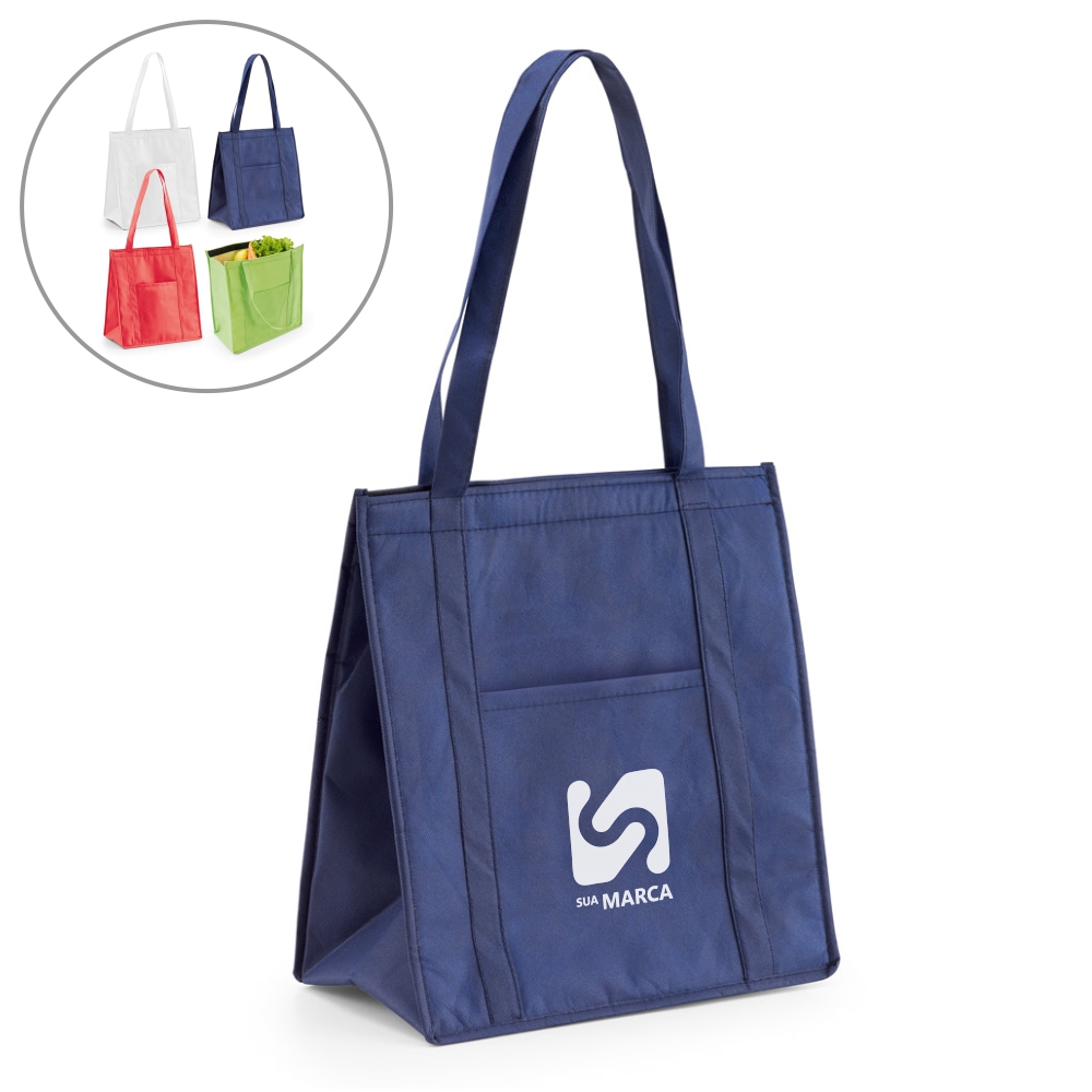 Sacola térmica. Non-woven: 80 g/m². Com fechamento em velcro e bolso frontal. Capacidade até 10 litros. Food grade. 320 x 350 x 170 mm.