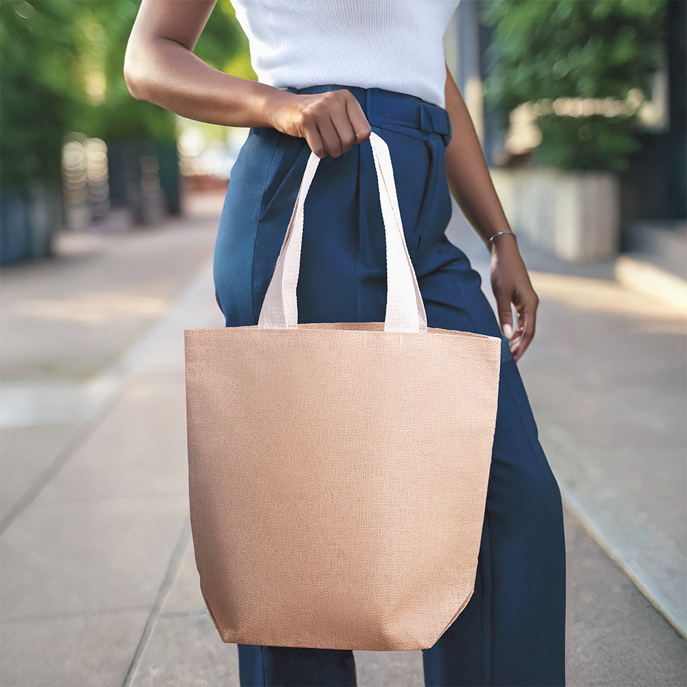 Sacola em Juta 360g/m² com alça em algodão cru e base plana.