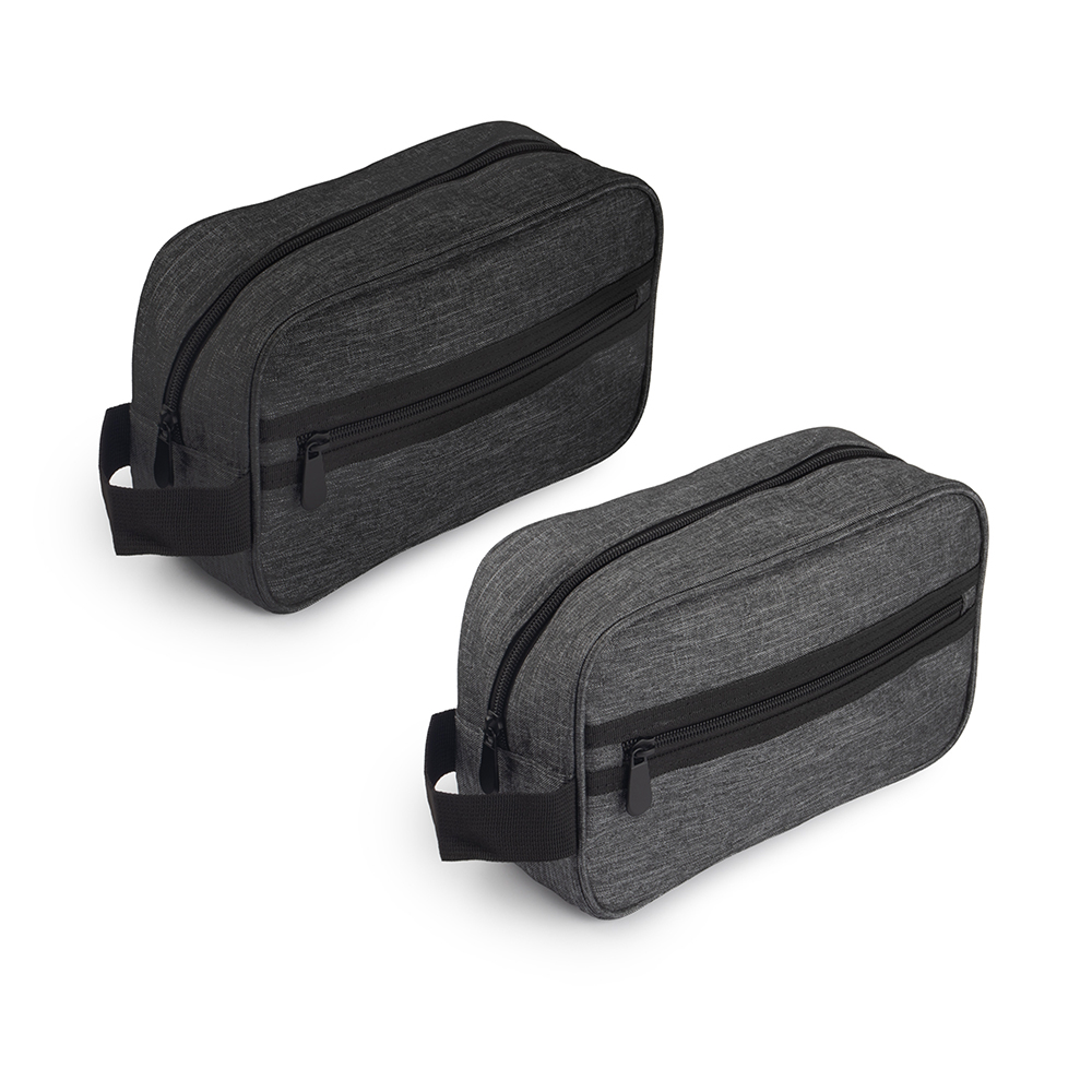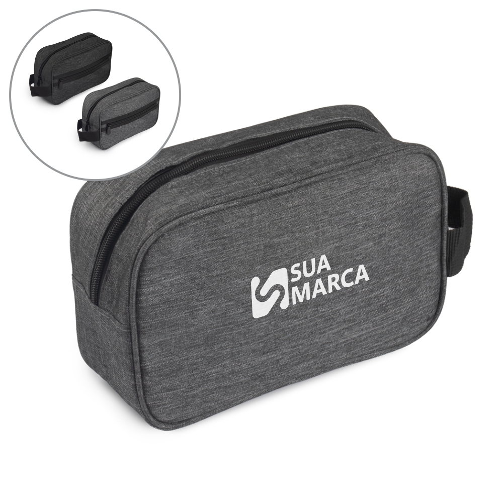 Necessarie em tecido poliéster, alça de mão e bolso externo com zíper.