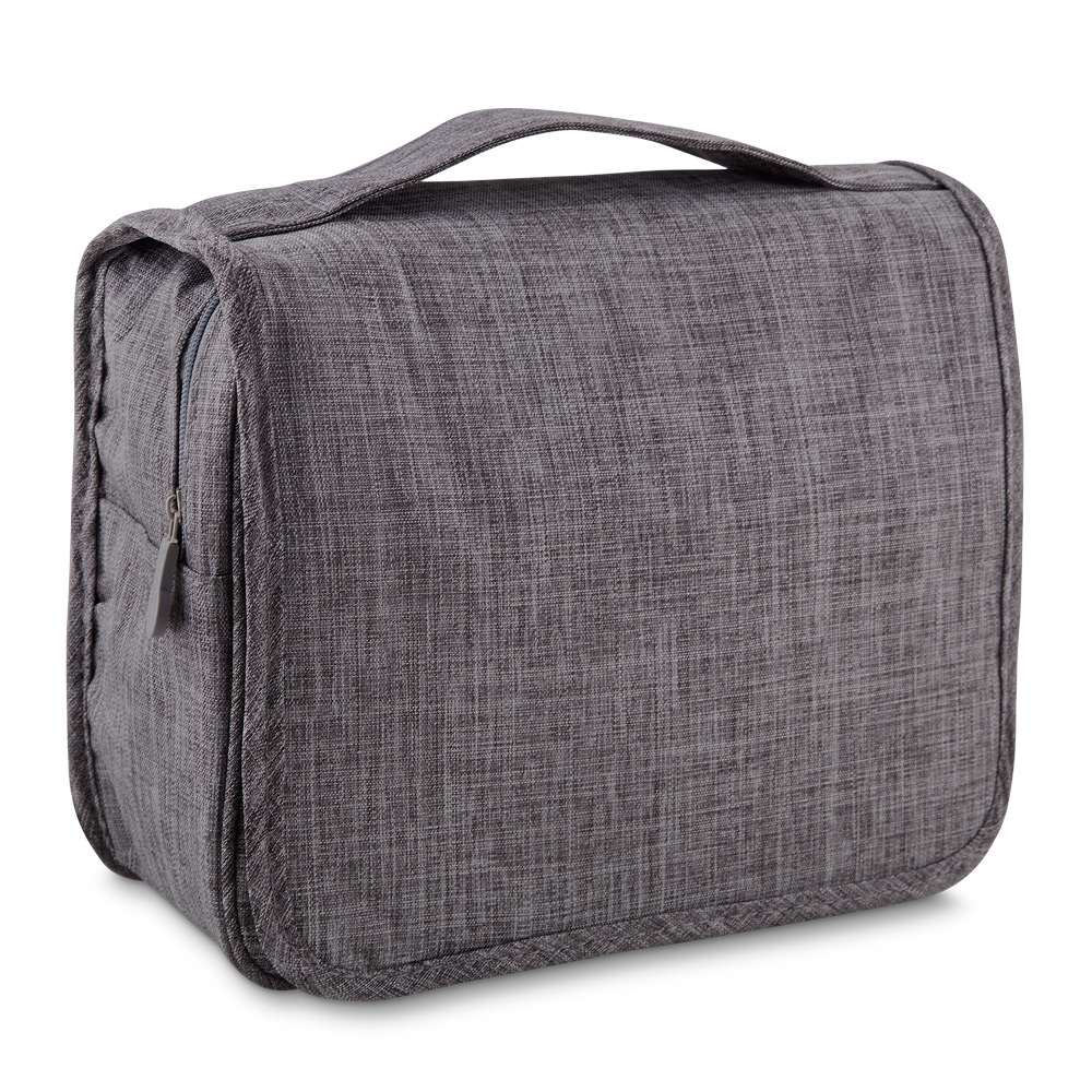 Necessaire em tecido polyester, com excelente espaço interno, bolso frontal e no verso. Suporte para pendurar.
