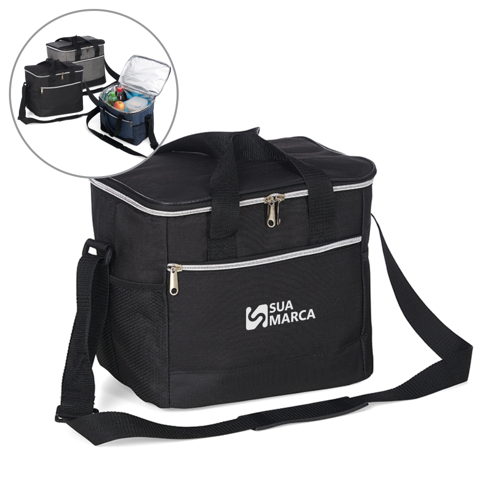 Descrição: Bolsa térmica 18 litros. Contém bolso frontal com zíper, bolsos laterais telados, alça de mão em nylon e alça transversal regulável (não removível) com apoio para ombro.