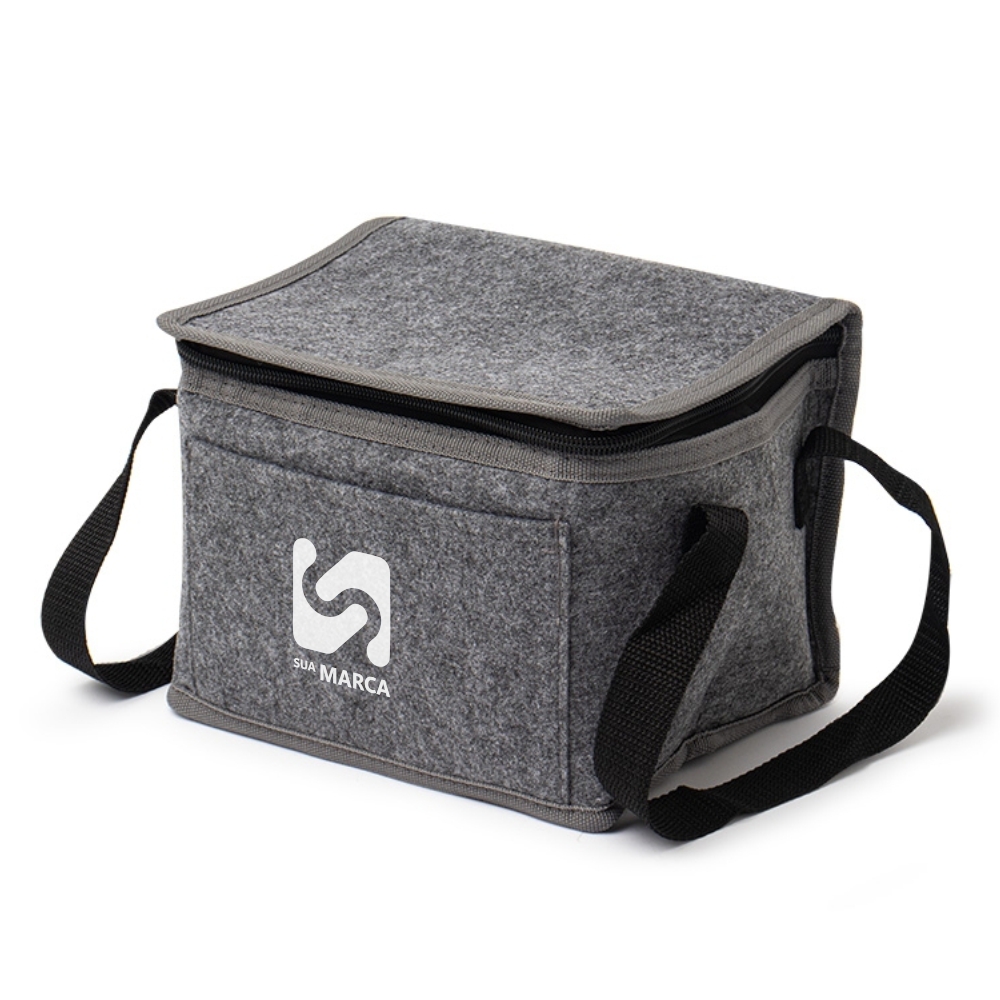 Descrição: Bolsa térmica em tecido feltro com capacidade para 5 litros, possui revestimento térmico, bolso frontal e alças para as mãos.