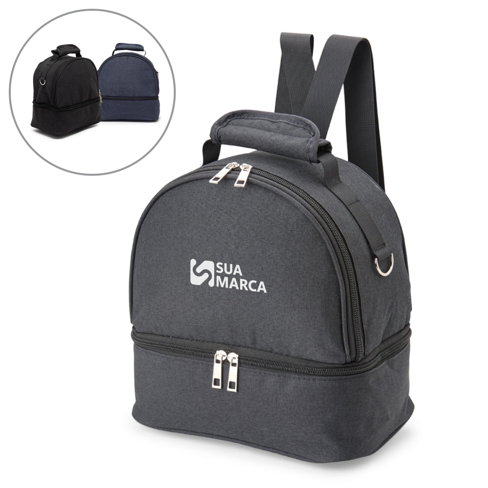 Descrição: Bolsa térmica dupla em nylon com dois compartimentos térmicos isolados, capacidade de 7 litros. Contém bolso traseiro com zíper, alça de mão e alça para as costas.