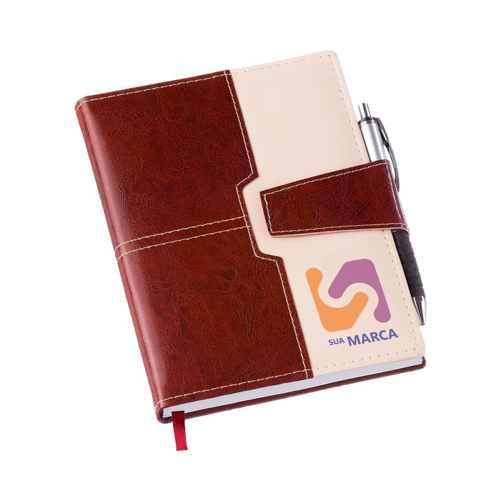 Agenda diária 2026 executiva marrom com fecho de imã e suporte para caneta (não inclusa) em couro sintético 0,6mm.