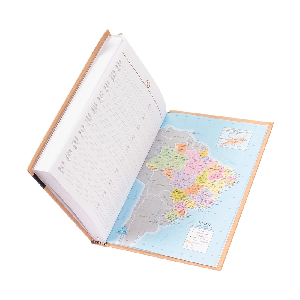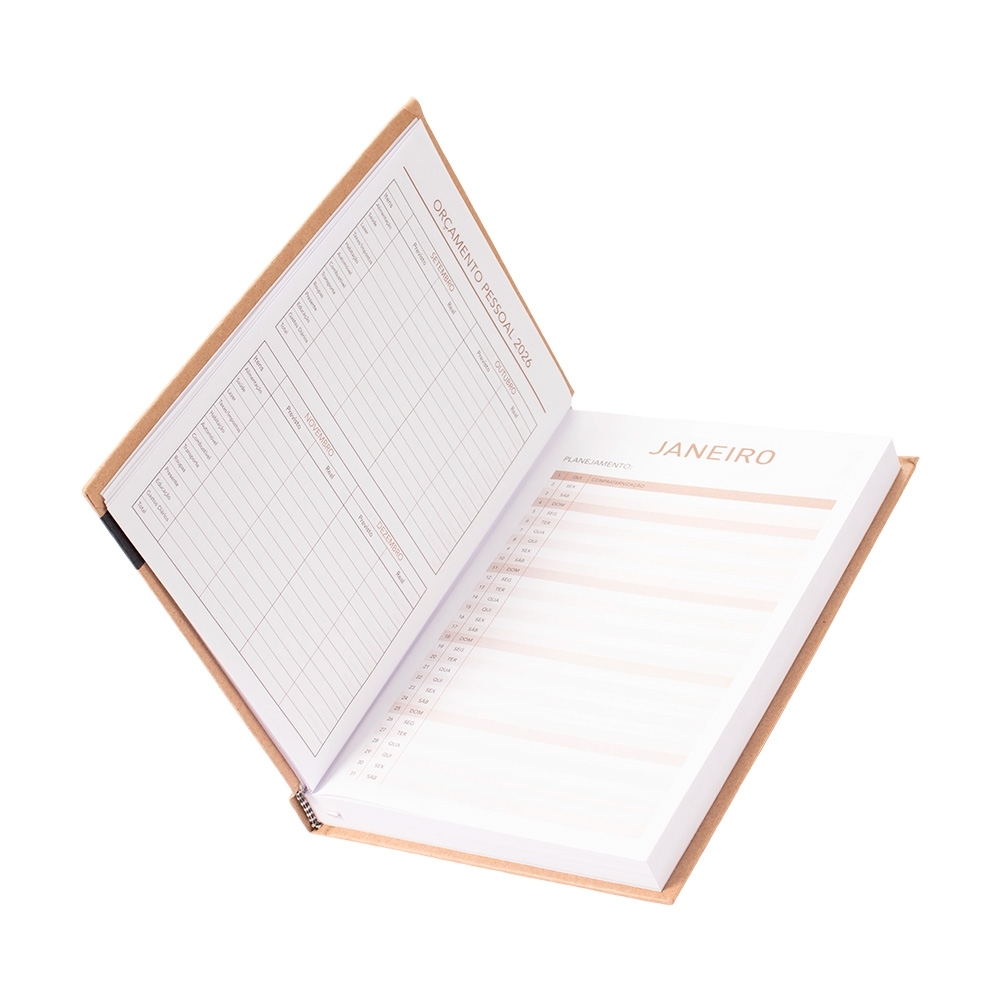 Descrição: Agenda diária modelo 2026 de capa dura em kraft e marcador de páginas em fita de cetim. Apresenta páginas dedicadas à dados pessoais, calendários de 2025 até 2027, orçamentos pessoais, anotações, planejamento mensal, endereços de contato e mapas.