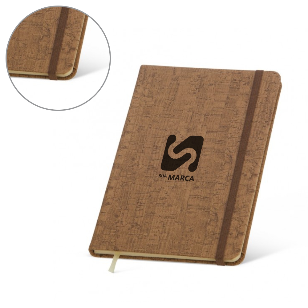 Caderneta em cortiça, possui marca página em cetim e elástico para lacre. Contém aproximadamente 80 folhas marfim sem pauta.