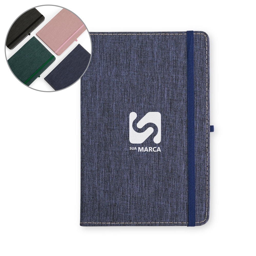 Descrição: Caderneta com capa dura em linho, fechamento em elástico, marca-páginas em fita de cetim e porta-caneta elástico. Possui cerca de 80 folhas brancas pautadas.