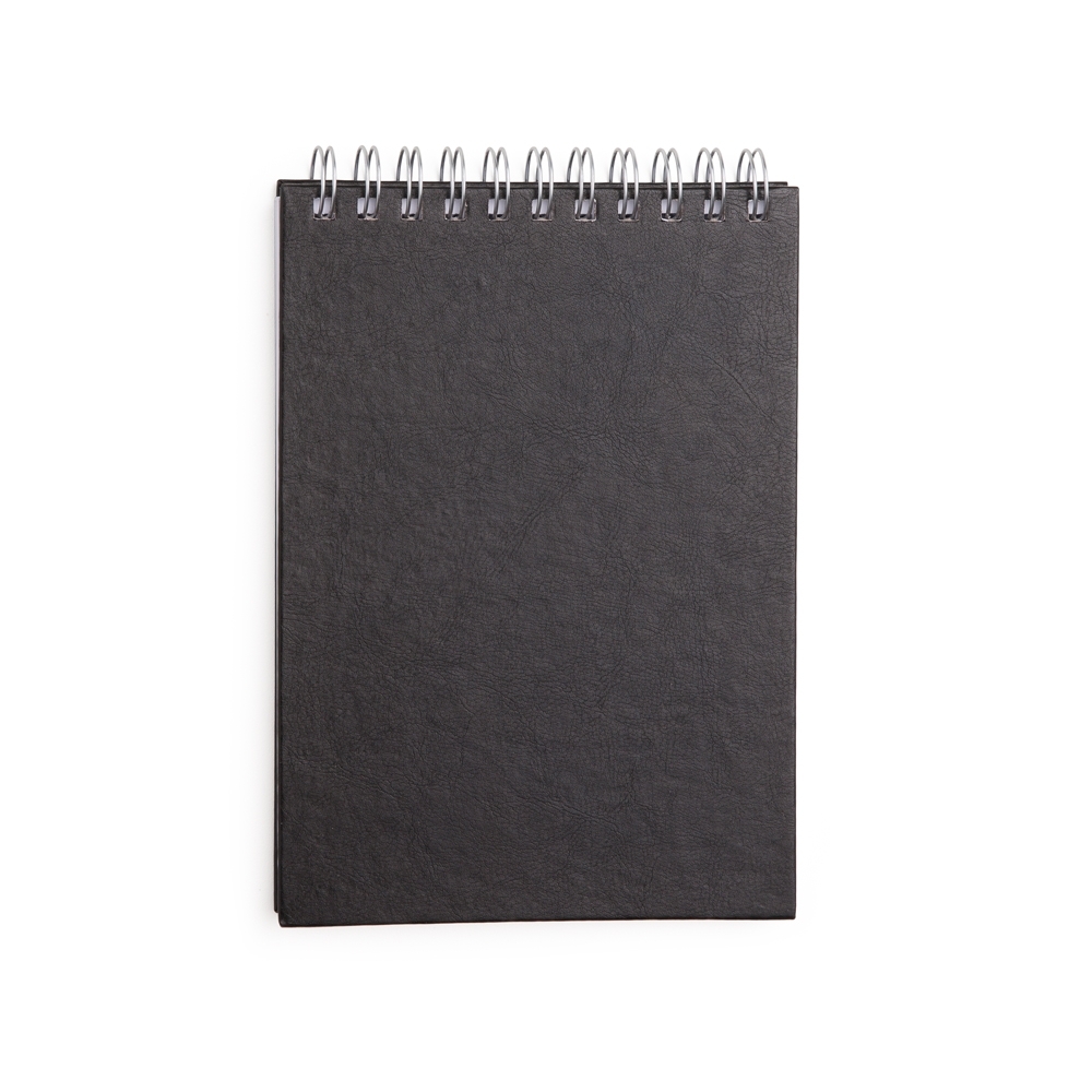 Descrição: Bloco de anotações em couro sintético texturizado e espiral prata metálico. Possui aproximadamente 80 folhas brancas sem pauta, abertura superior.