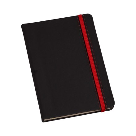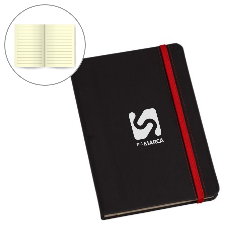 Caderneta Grande Tipo Moleskine Capa Preta com Costura e Elástico Vermleho COM PAUTA - 80 Folhas Com Pauta. Formato: 14x21cm - Miolo em papel PÓLEN NATURAL levemente amarelado - 80 gramas - Capa em couro sintético emborrachado - com elástico. Formato: 13,75x20,5cm