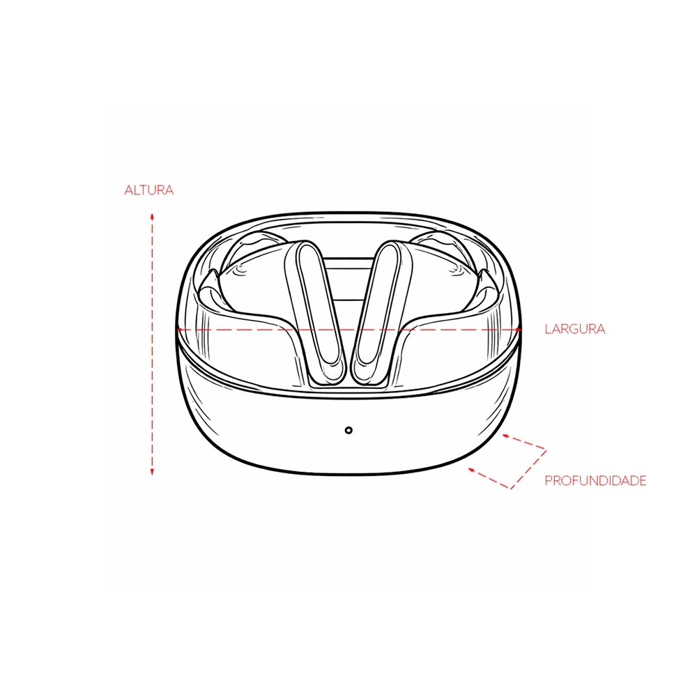 Fones de ouvido sem fio com estrutura em plástico resistente a leves respingos de água. Apresenta conexão Bluetooth 5.4 e responde a comandos por toque, além de estojo para carregamento em plástico texturizado com entrada USB-C. Acompanha cordão em nylon com clipe plástico e cabo USB-C para recarga dos fones.