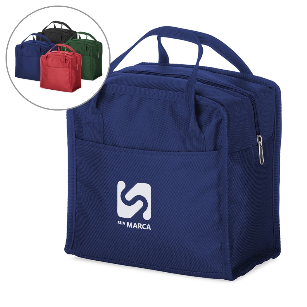 Bolsa térmica 7 litros em nylon com dois bolsos externos nas laterais, alça para mãos e revestimento interno térmico. Acompanha plaquinha para personalização avulsa.