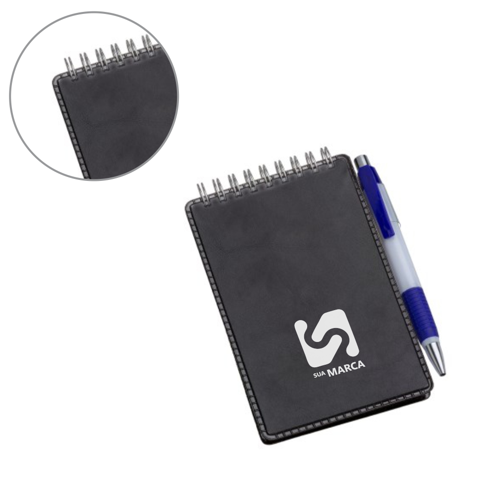 Caderneta de Anotações Vertical em Couro Ecológico Preta - Formato: 90mm X 140mm com 100 Folhas Brancas e Suporte para Caneta.