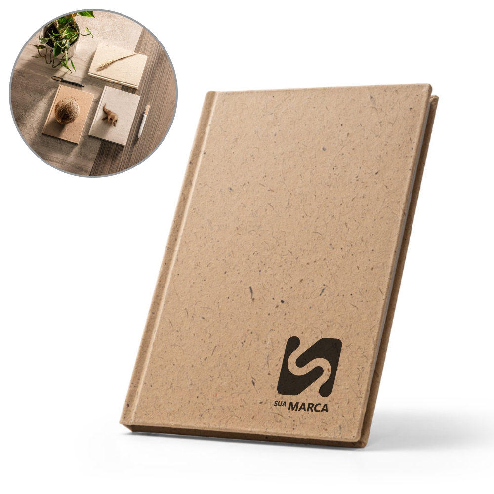Caderno A5 de capa dura em casca de coco (60%) e pedaços de algodão reciclado (40%). Contém 160 páginas pautadas de papel 100% reciclado. Um caderno que se distingue por dar uma segunda vida a materiais que podem ser reciclados. 145 x 205 mm