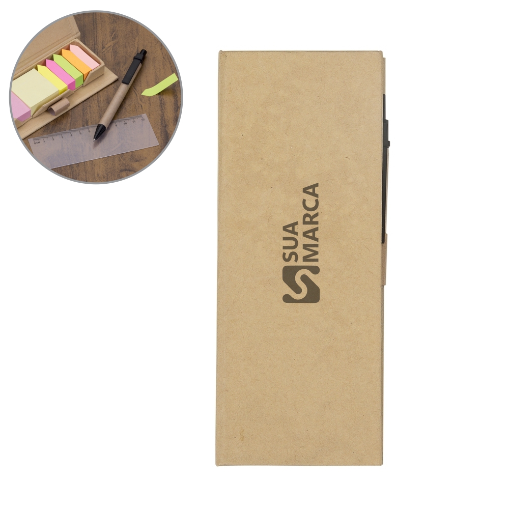 Bloco de anotações ecológico com caneta e autoadesivos. Bloco retangular de papelão com frente e verso liso, contra capa possui um “bolso” com régua plástica fosca de 12 cm. Possui cinco blocos coloridos autoadesivos com aproximadamente 130 folhas e dois blocos rascunho rosa e amarelo com aproximadamente 130 folhas. Suporte de papel com caneta de papelão de clip e ponteira plástica.