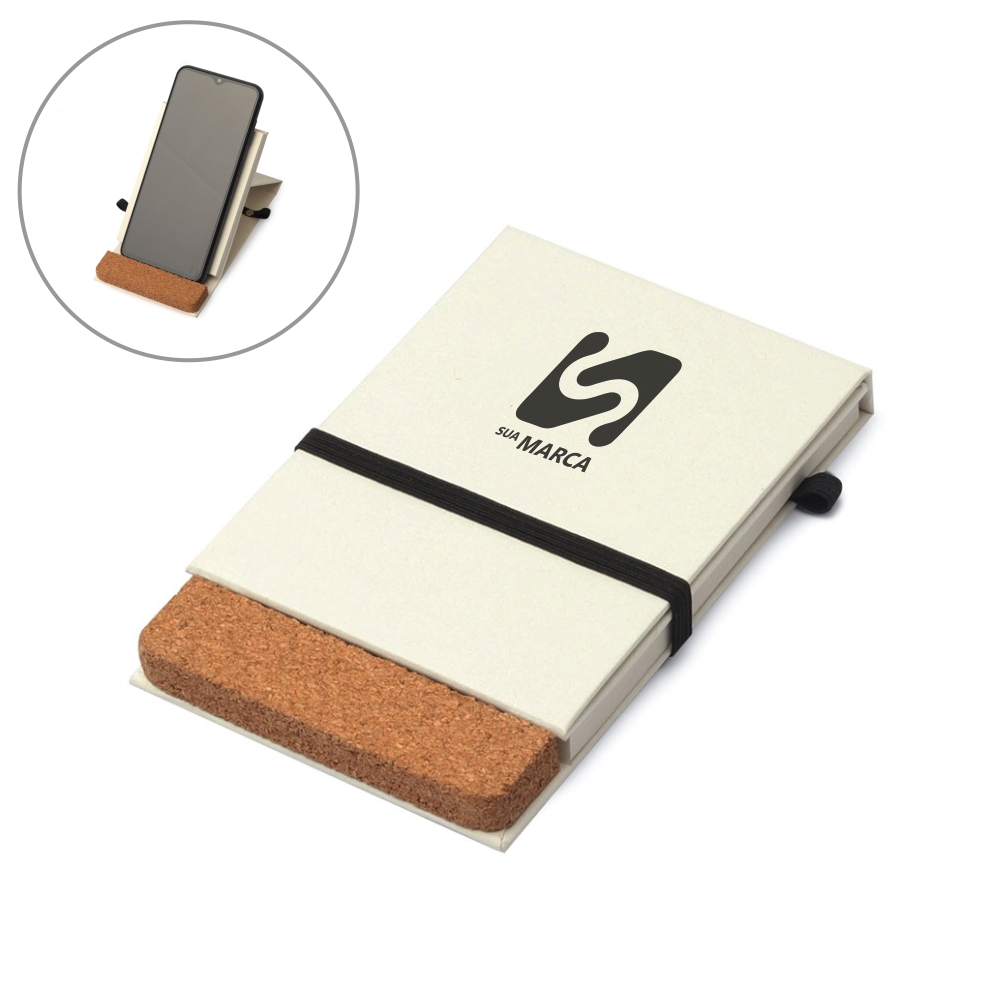 Bloco de anotações ecológico com suporte para caneta, capa com fragmento de cortiça para utilização como suporte de celular. Capa dura feita com papel de caixa de leite, contém aproximadamente 80 folhas marfim sem pauta e elástico para lacre.